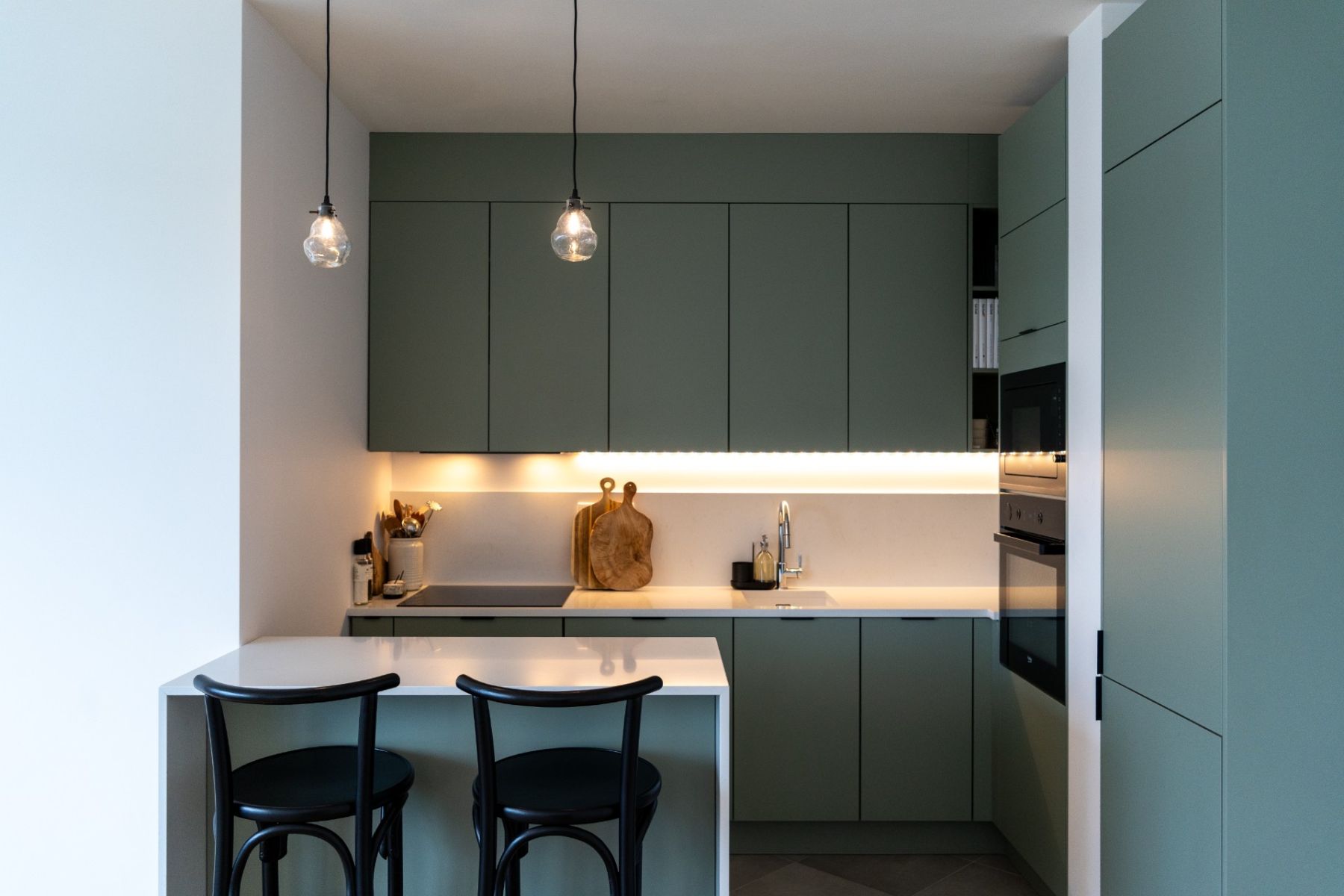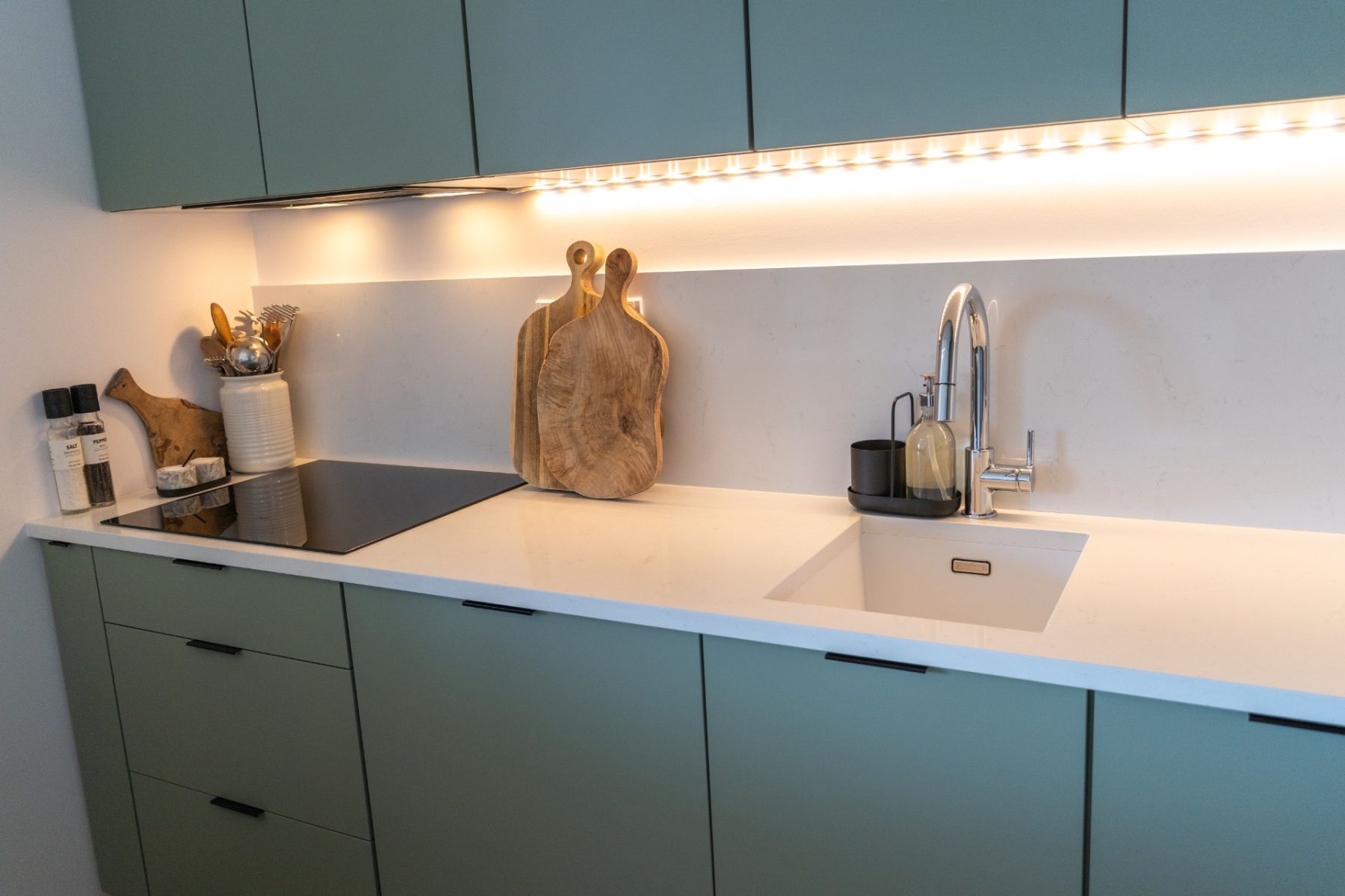 Kuchyňská linka je v barvě sage green v kombinaci s pracovní deskou z umělého kamene Technistone ve vzoru mramoru, která vyniká svou odolností i estetickým vzhledem.