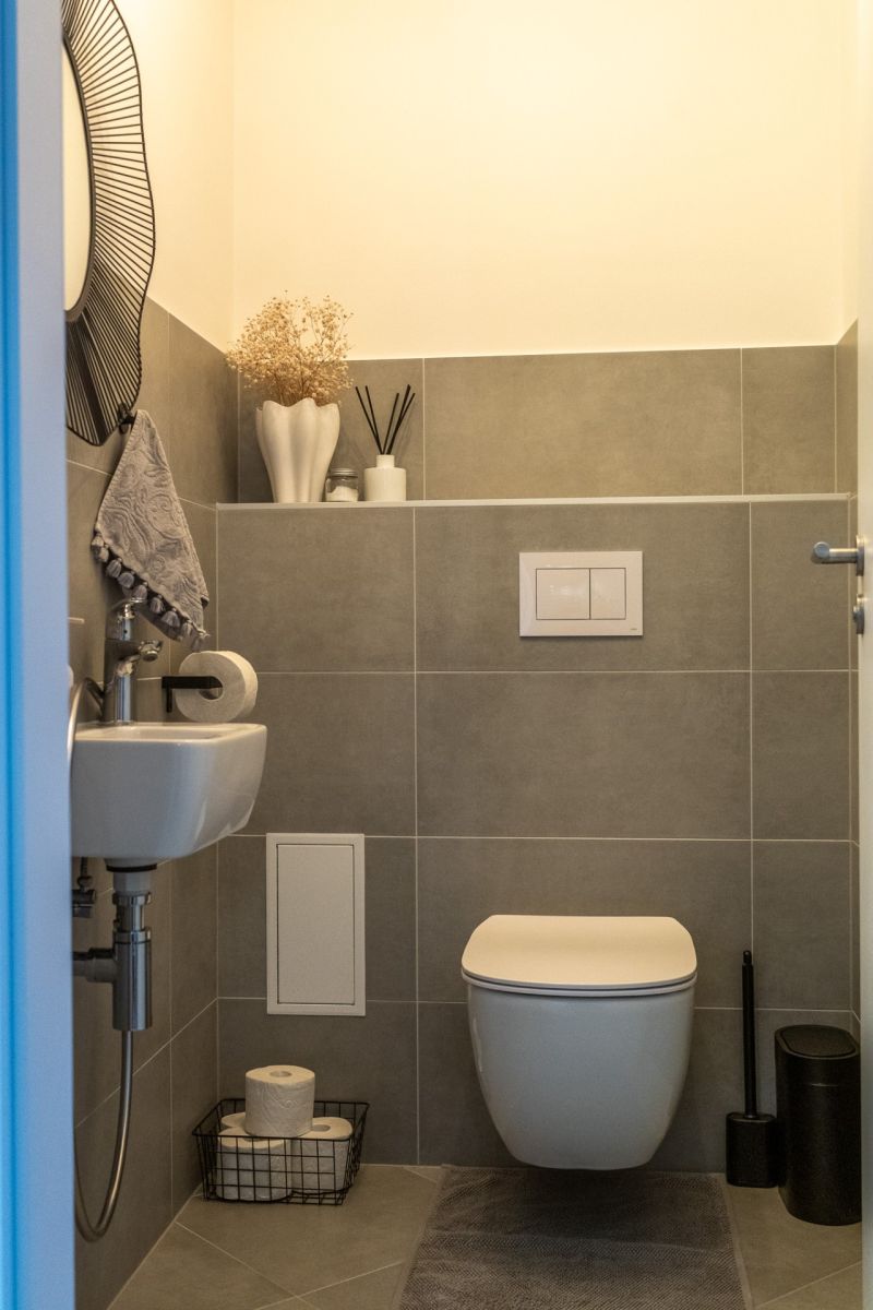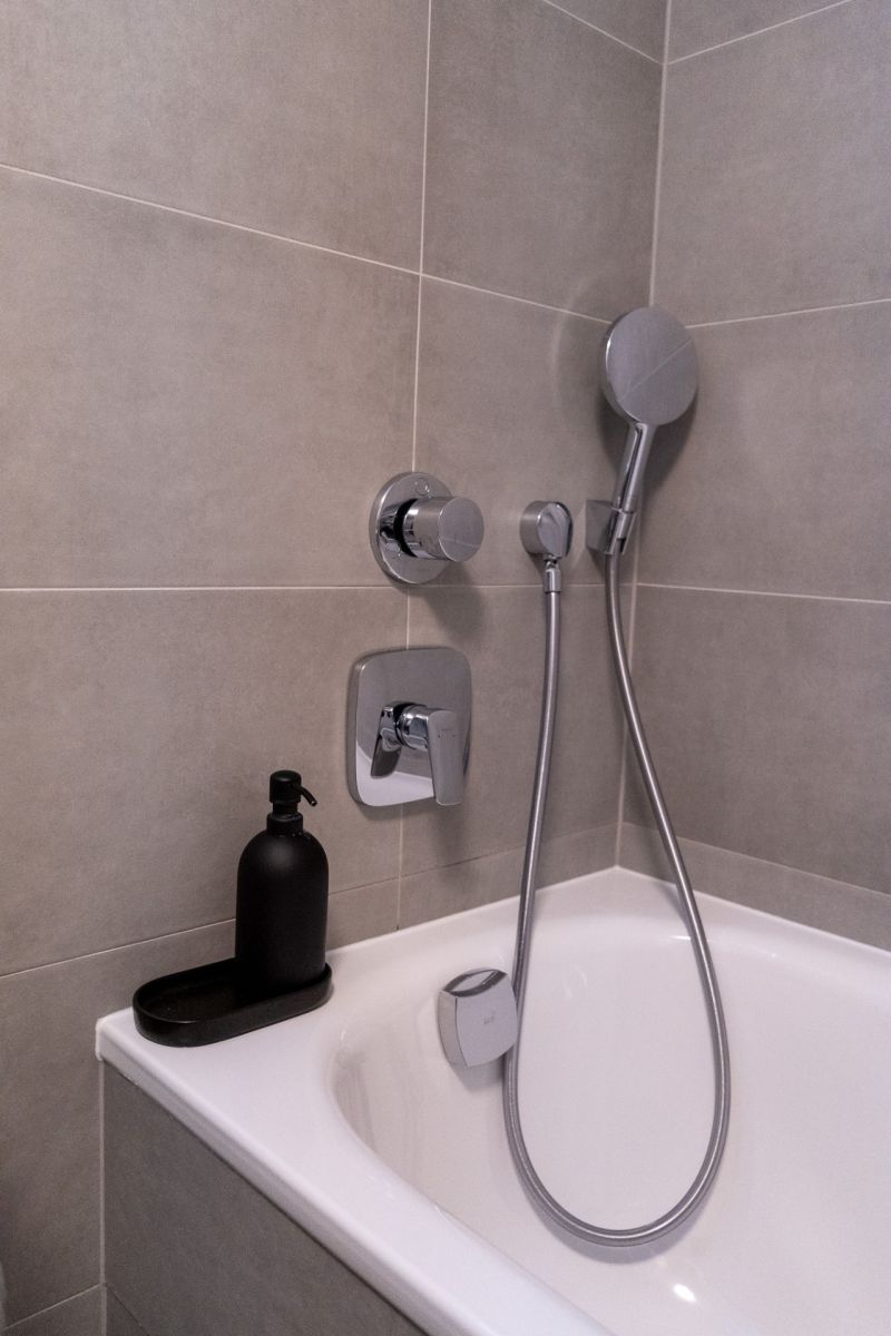 Koupelna je vybavena kvalitní sanitou a designovými bateriemi značky Hansgrohe, které zaručují dlouhou životnost a vysoký komfort při každodenním používání.