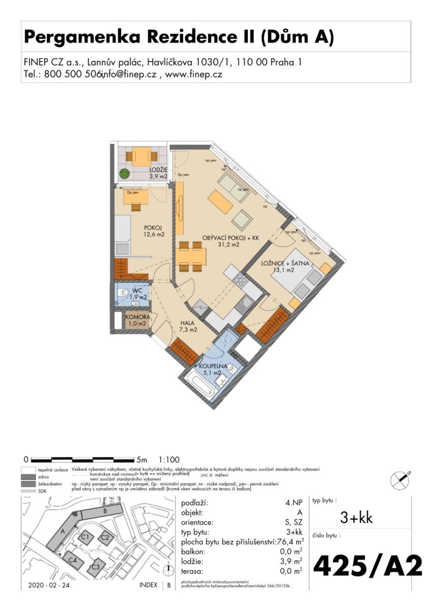 Nabízím k prodeji světlý a prostorný byt o dispozici 3+kk a velikosti 76,4 m² (včetně lodžie 3,9 m²), který se nachází ve 4. nadzemním podlaží moderní novostavby se sedmi podlažími.