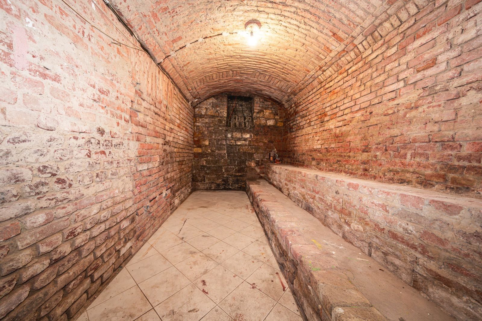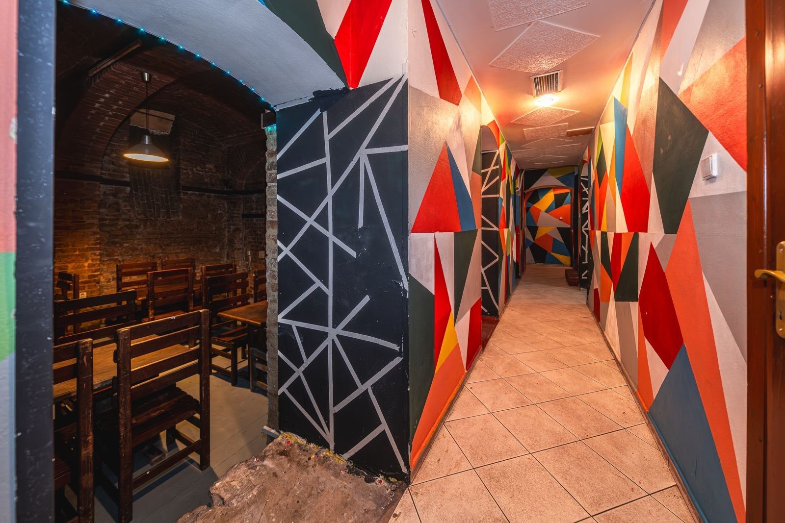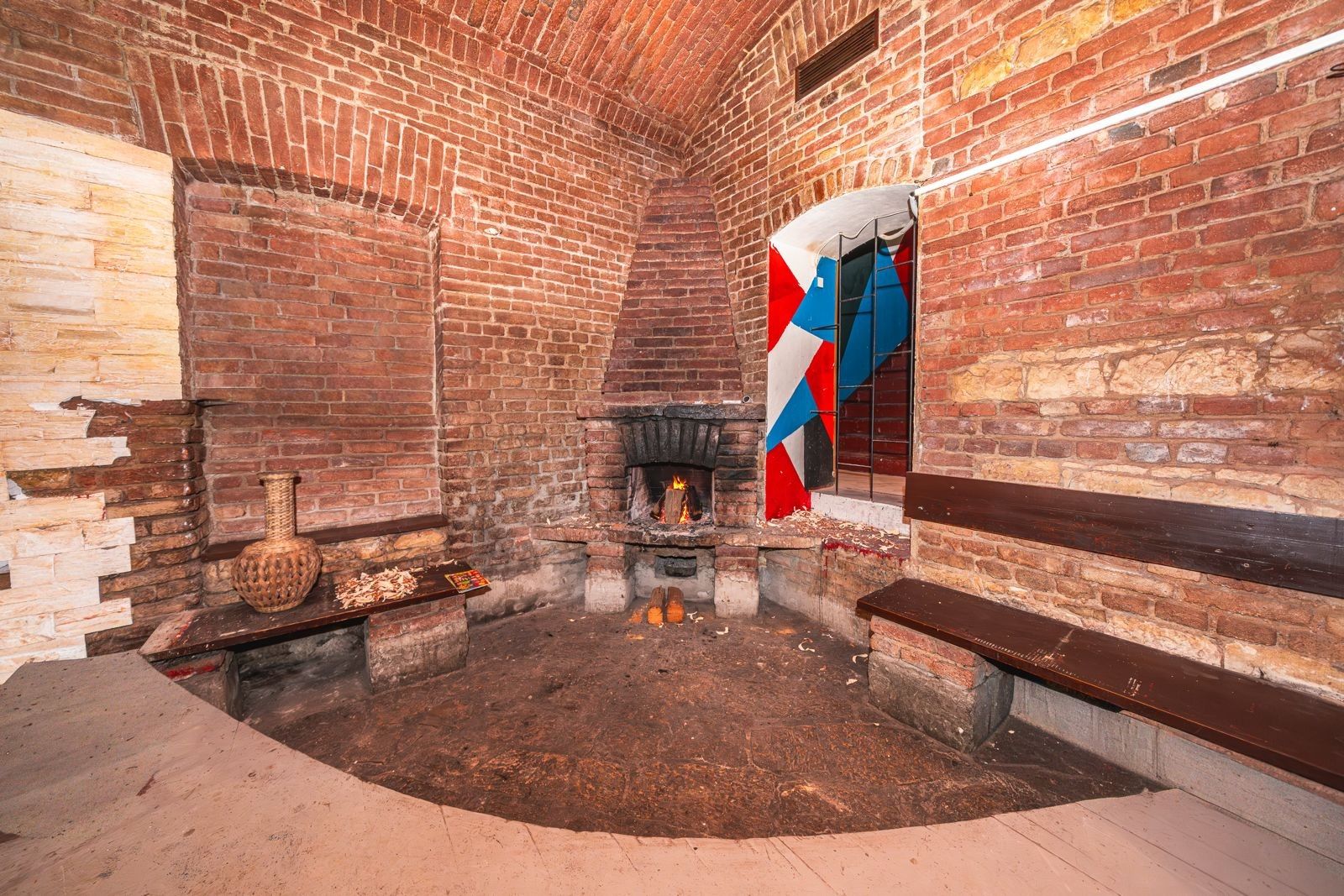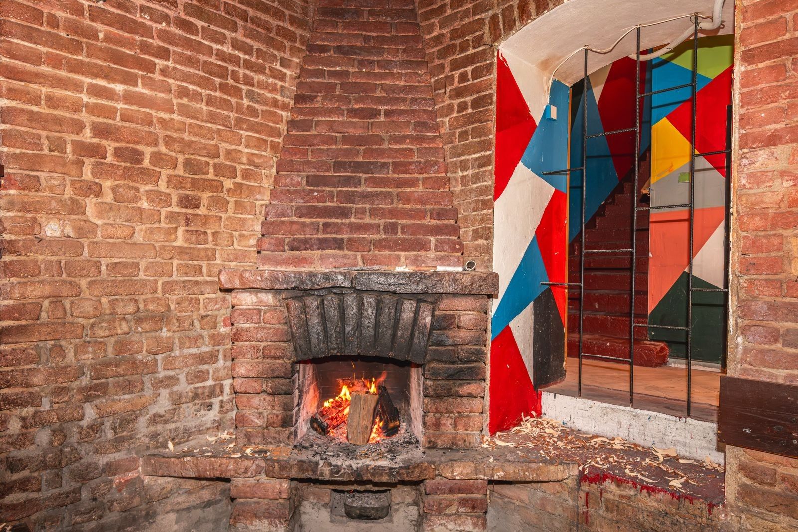 Atmosféra: Interiér s přiznanými cihlovými klenbami, funkčním krbem na dřevo a originálním geometrickým designem.