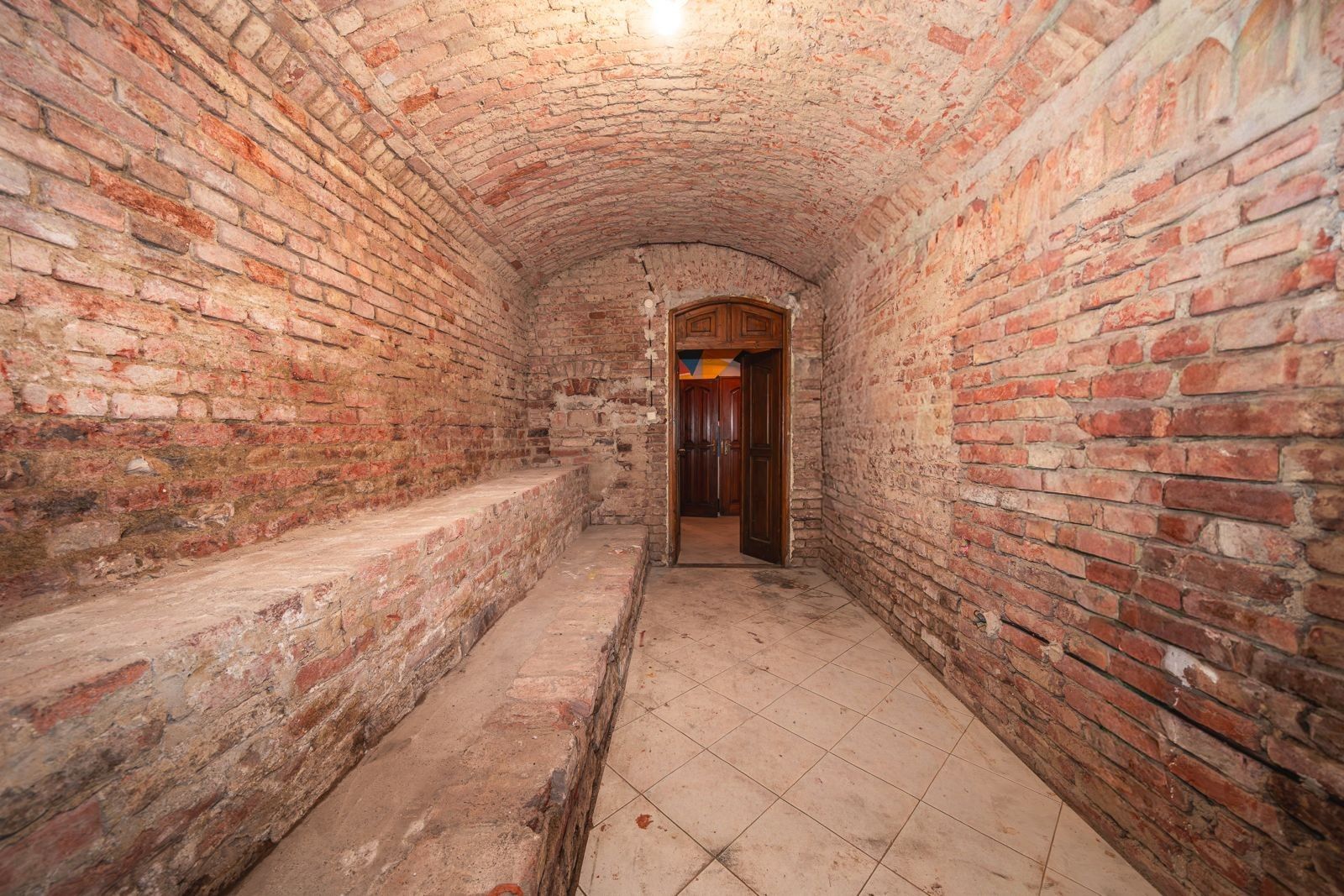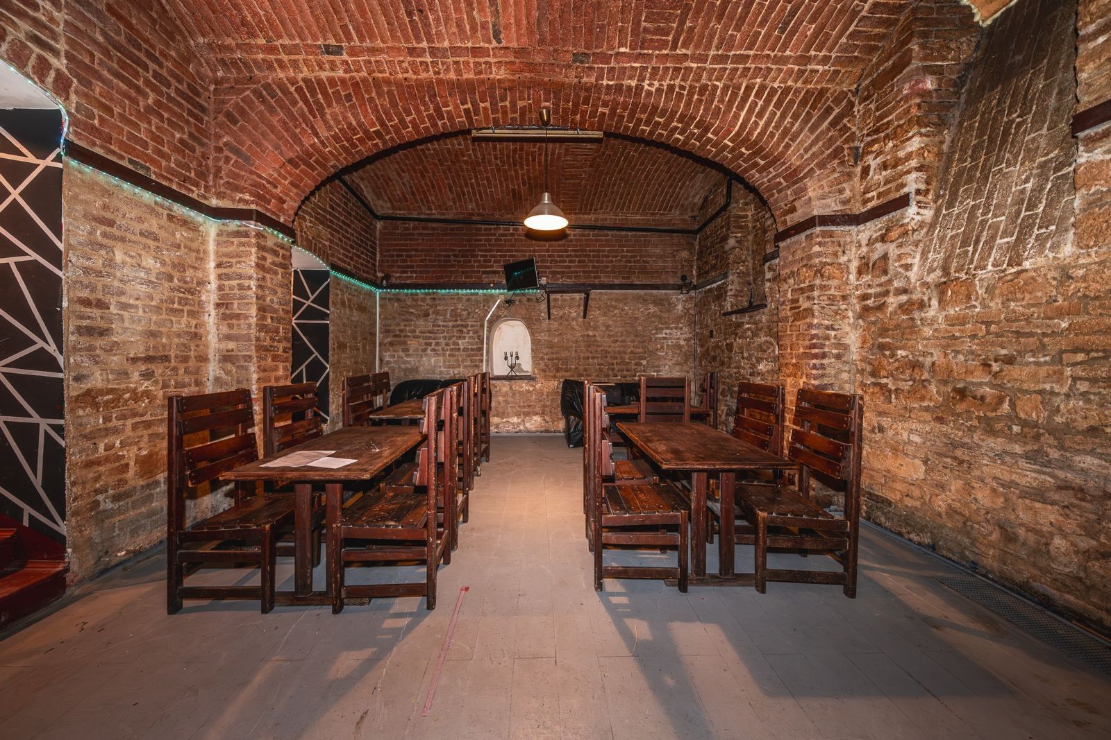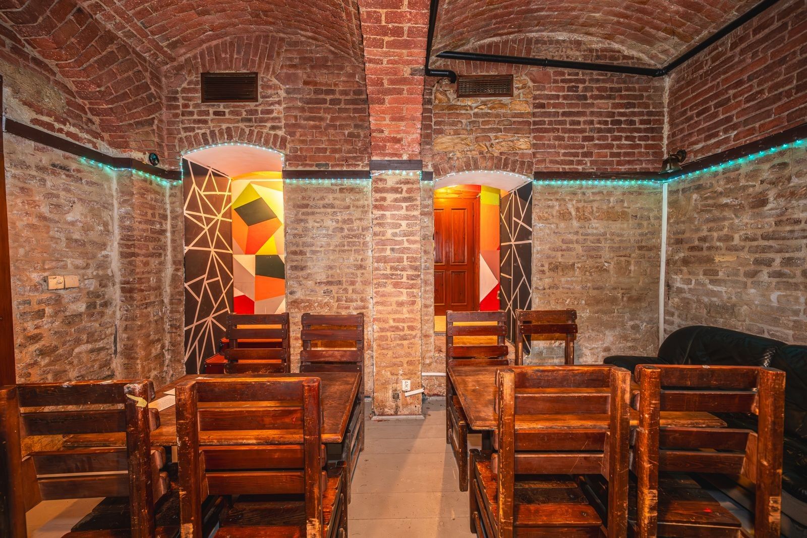 Atmosféra: Interiér s přiznanými cihlovými klenbami, funkčním krbem na dřevo a originálním geometrickým designem.