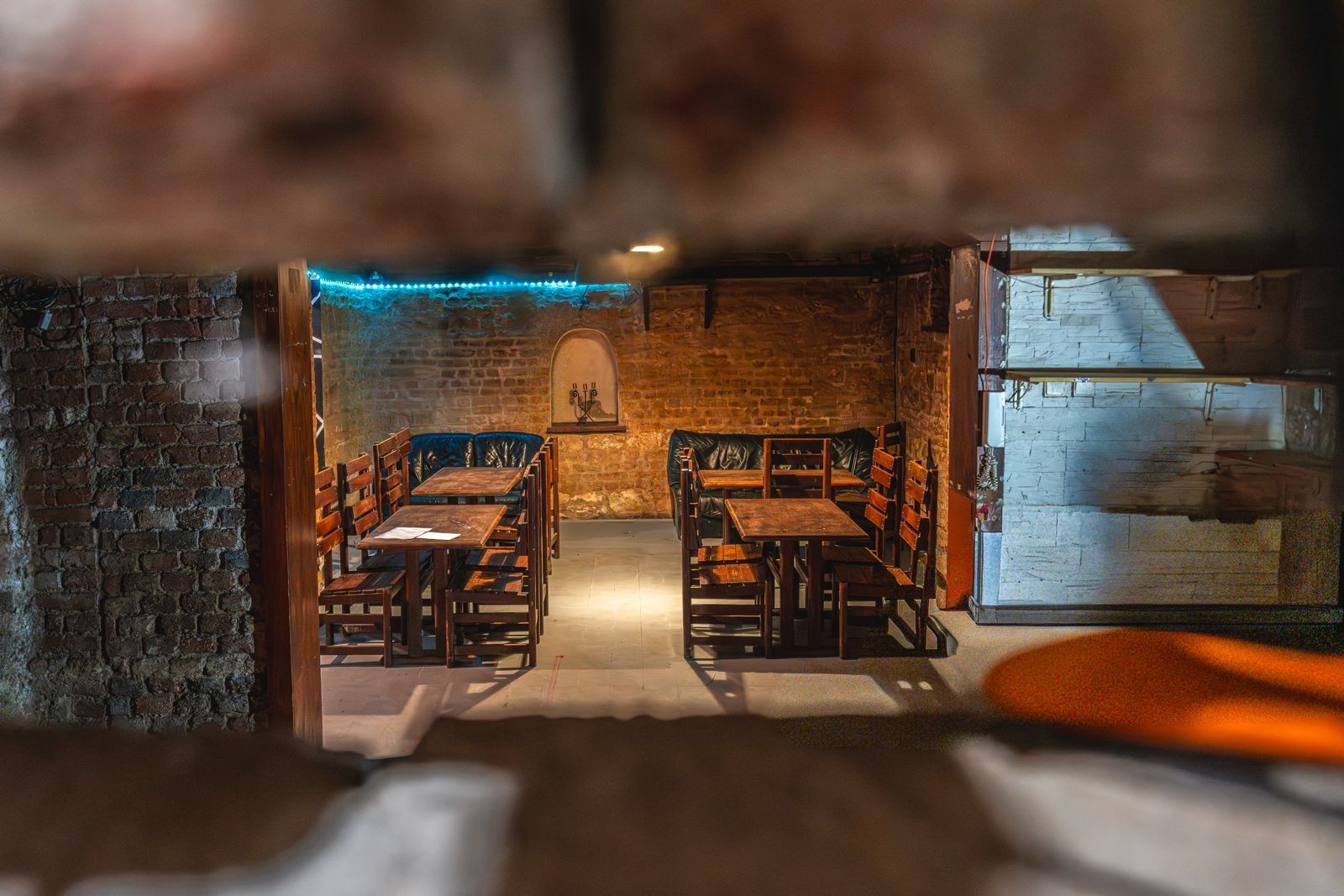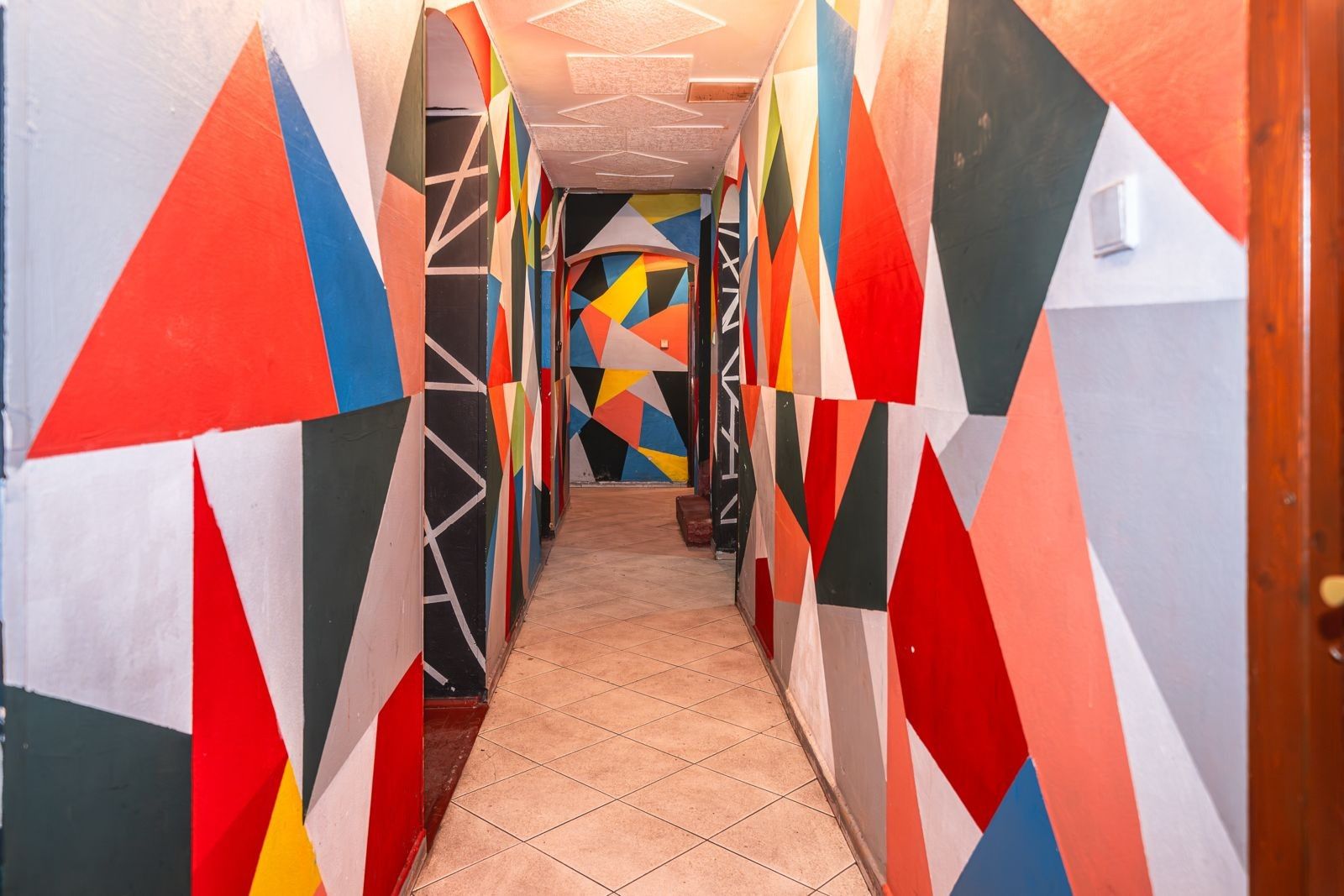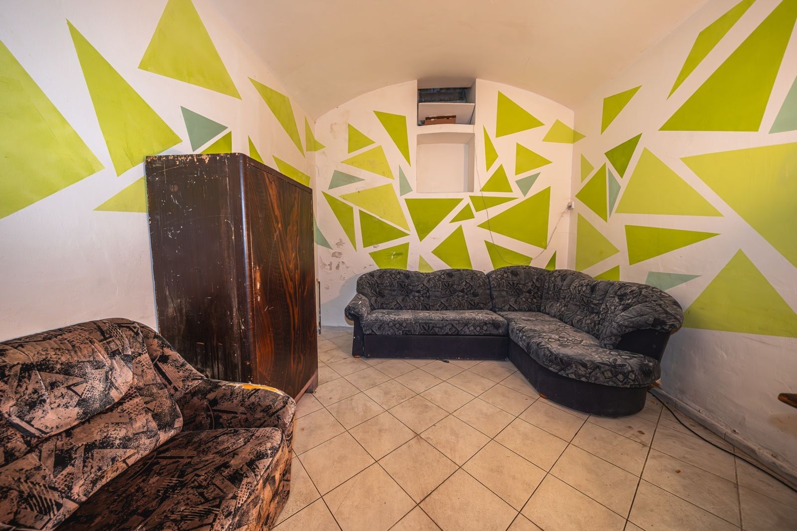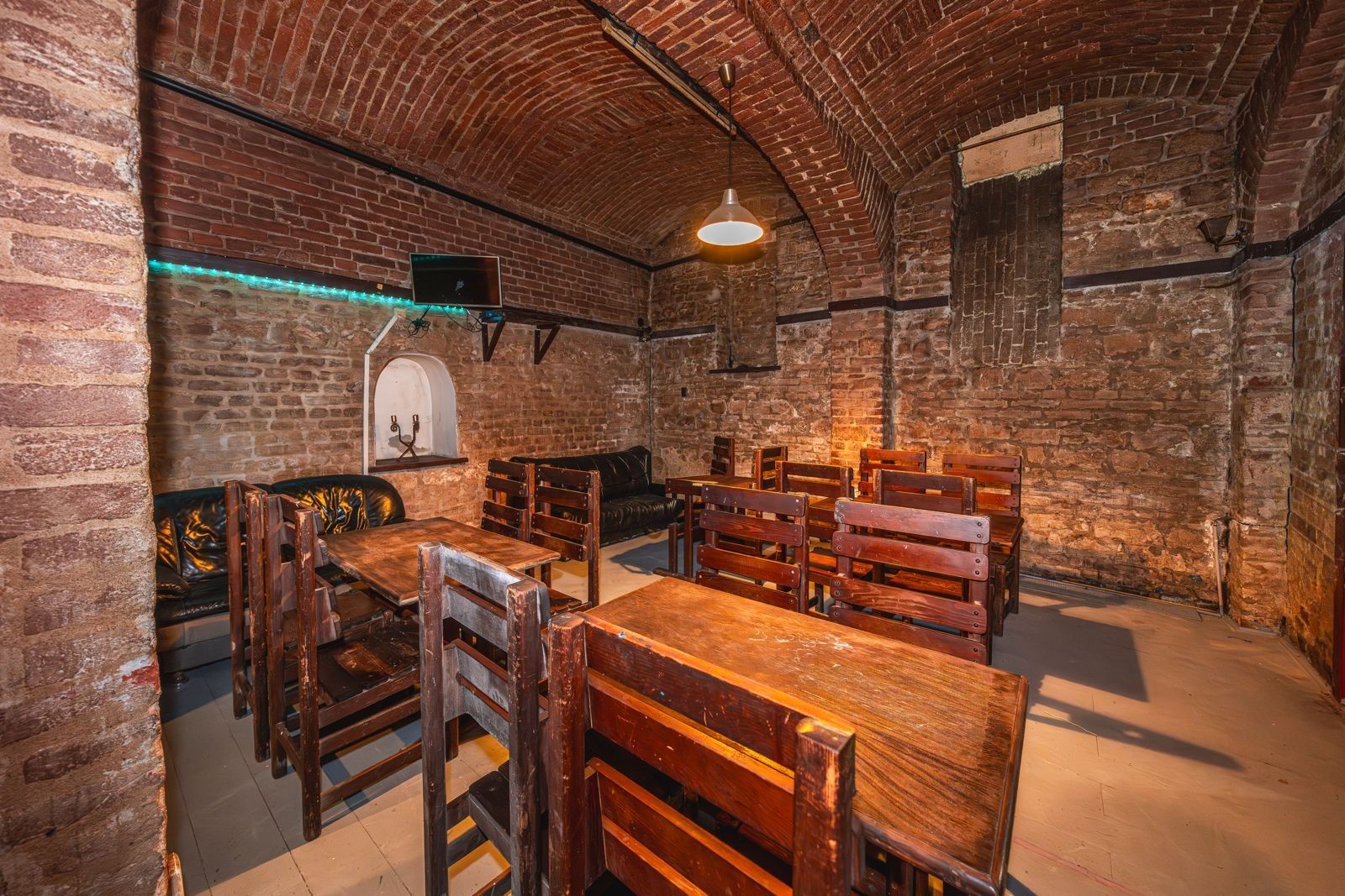 Atmosféra: Interiér s přiznanými cihlovými klenbami, funkčním krbem na dřevo a originálním geometrickým designem.
