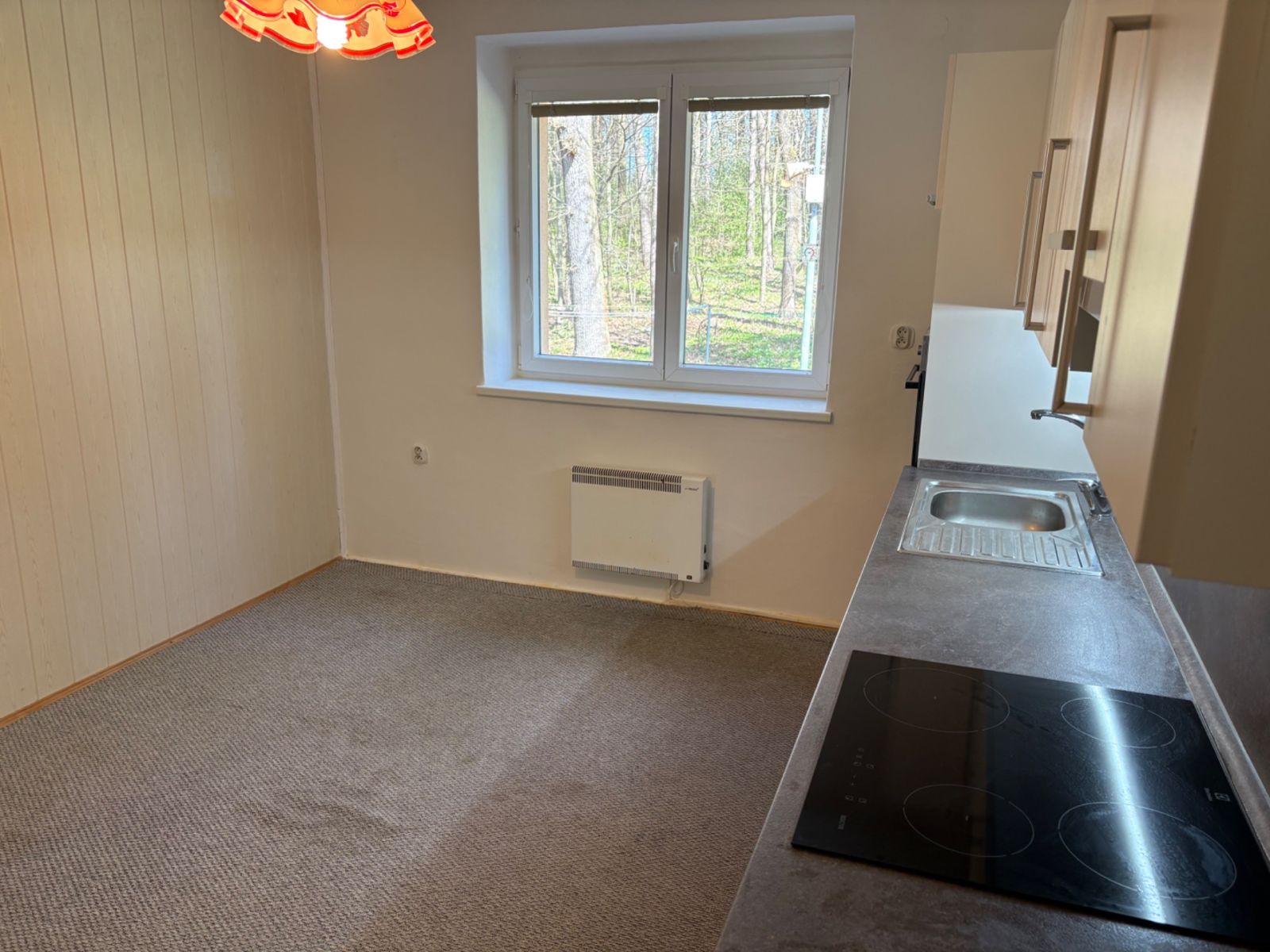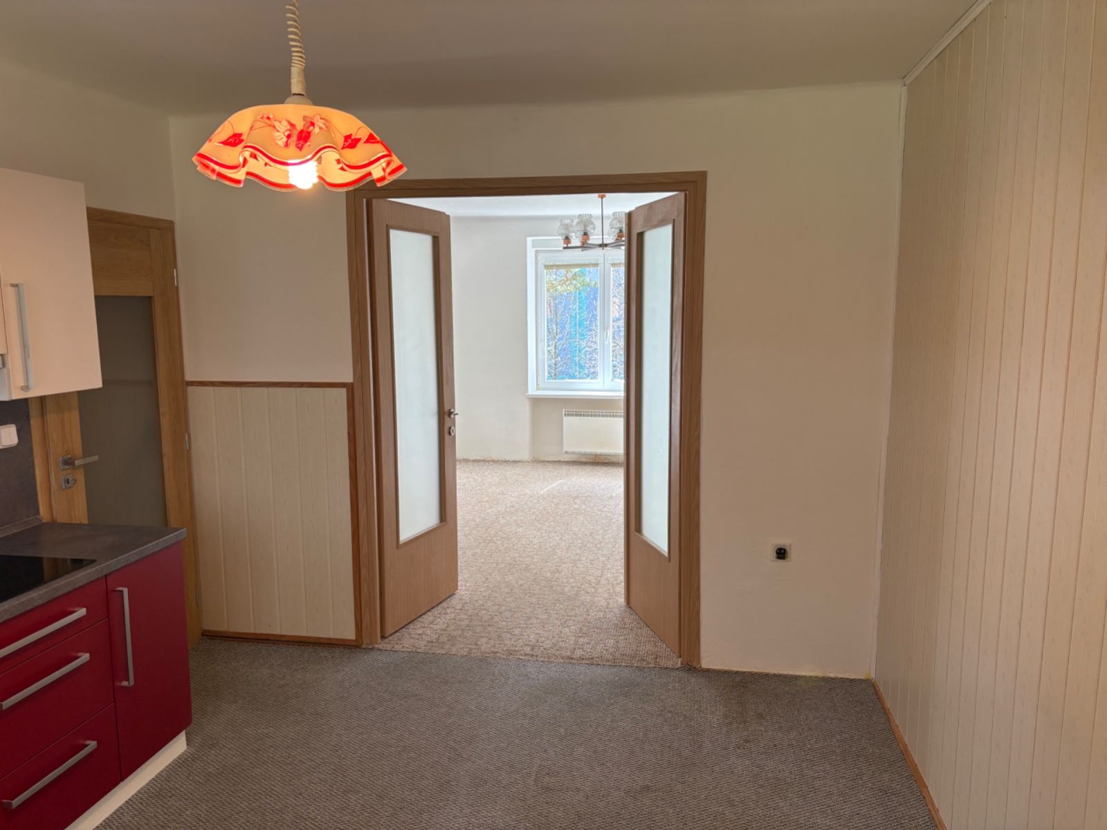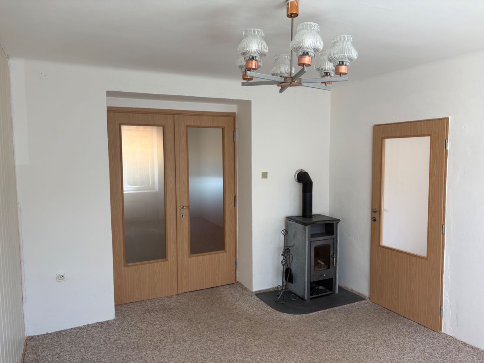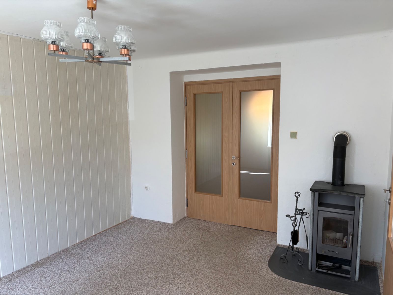 Interiér bytu je přehledný a funkční, ideální pro samostatné bydlení či mladou rodinu. Nemovitost je nevybavená, což umožňuje plné přizpůsobení interiéru dle vlastních představ a potřeb (nová kuchyňská linka, krbová kamna). K bytu náleží také sklep o rozloze 10 m², který poskytne dostatek prostoru pro uskladnění věcí.