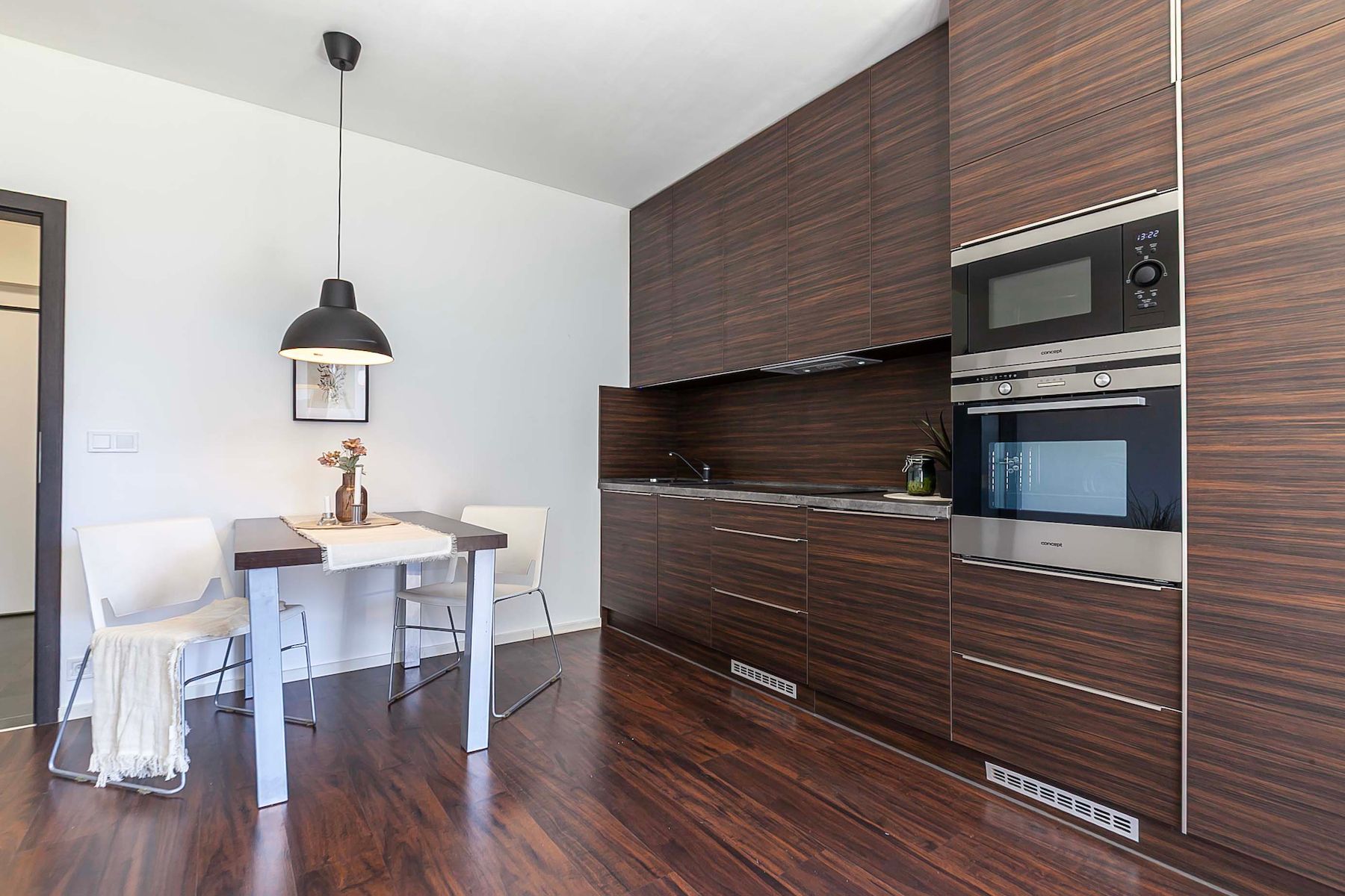 Elegantní, plně vybavená kuchyňská linka splňuje nároky na design i praktičnost. Koupelna nabízí nadstandardně prostorný sprchový kout, umyvadlo s osvětleným zrcadlem, toaletu a přípojku pro pračku. Předsíň poskytuje ideální prostor pro realizaci vestavěných úložných řešení.
