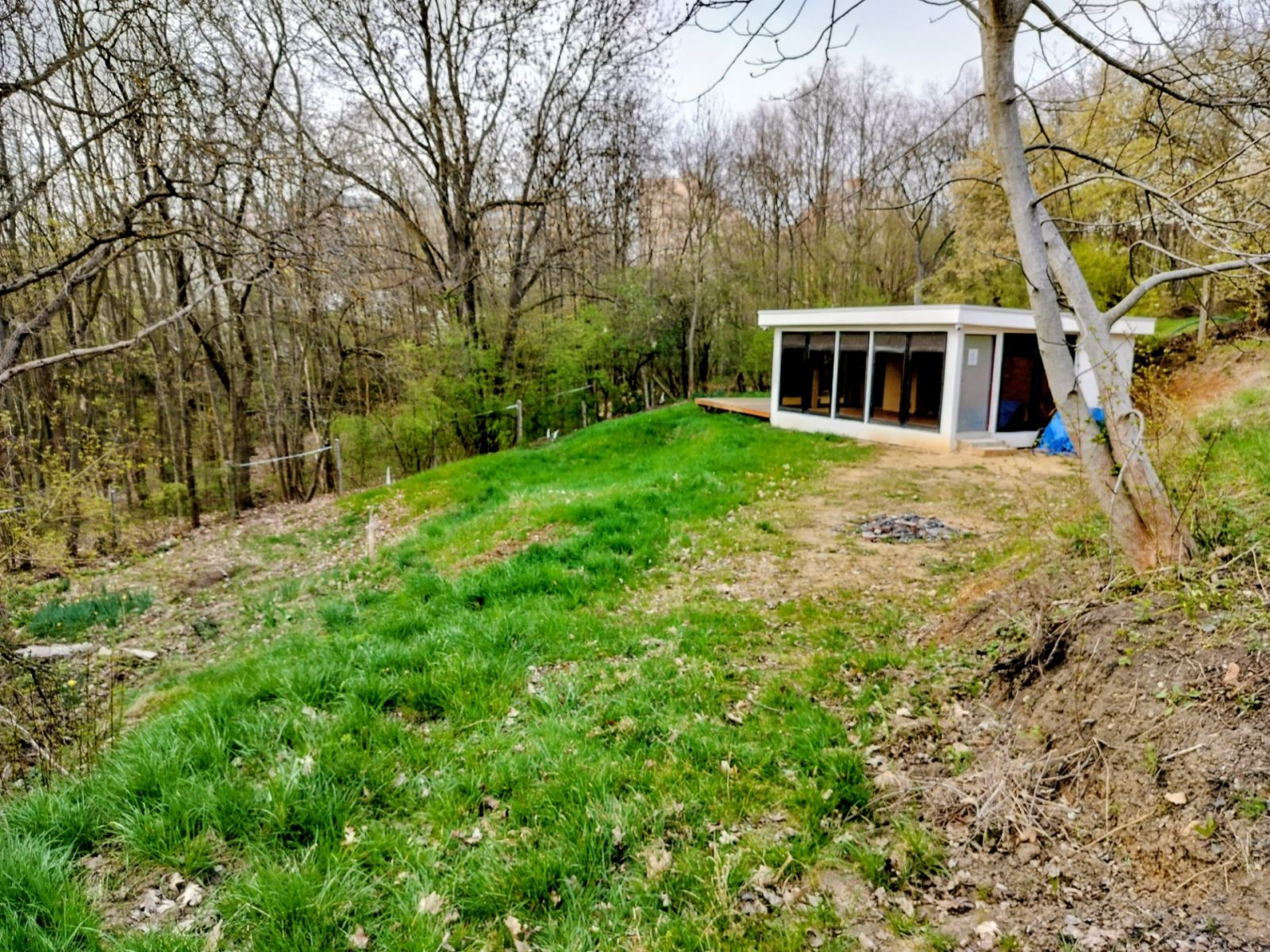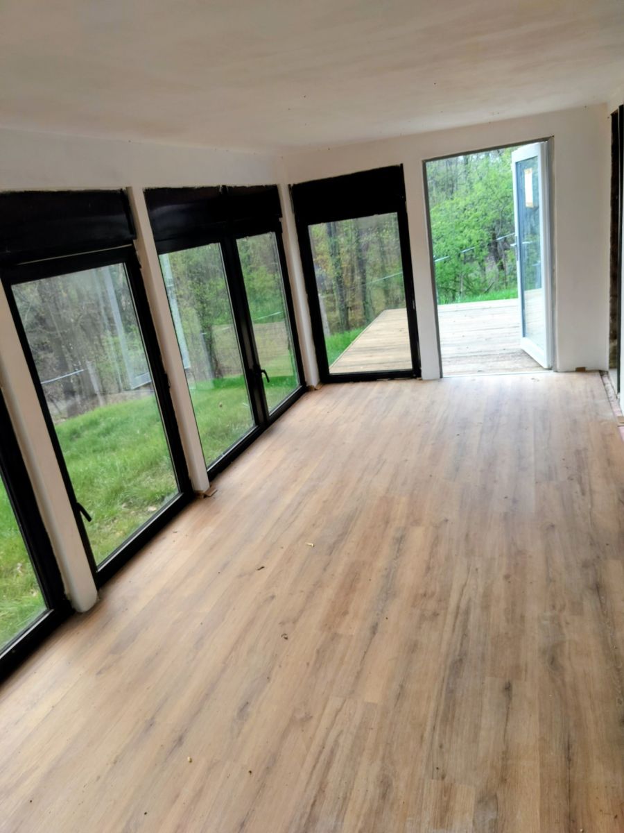 Na pozemku se nachází moderní, prosklená chatka s přímým vstupem na terasu. Interiér je otevřený a světlý, připravený k dokončení podle vlastních představ. Součástí je i koupelna, která je aktuálně ve stavu před dokončením.
