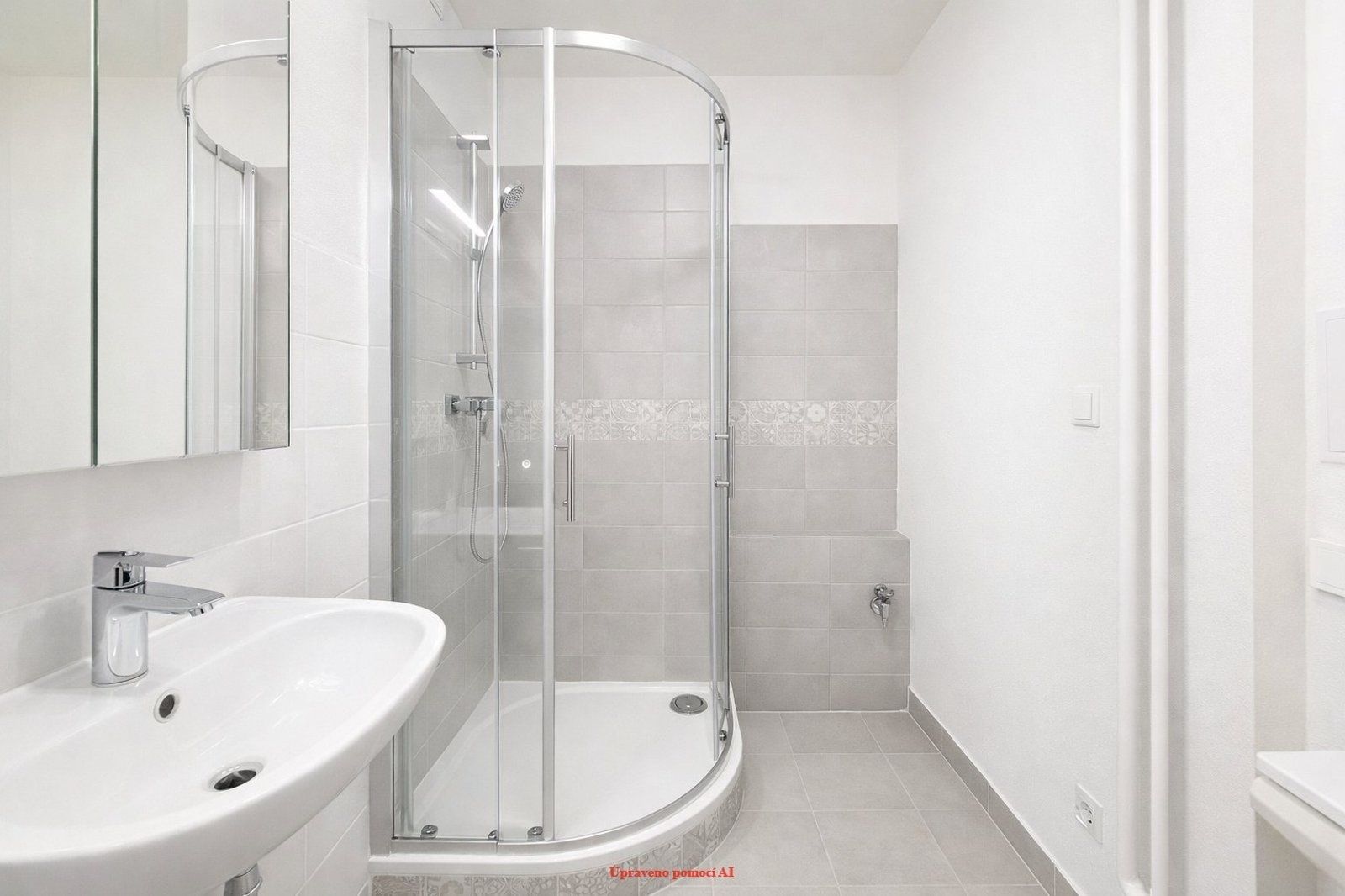 Koupelna projde kompletní proměnou a nabídne sprchový kout, nové umyvadlo, baterie a světlé obklady v příjemném bílo-béžovém dekoru.