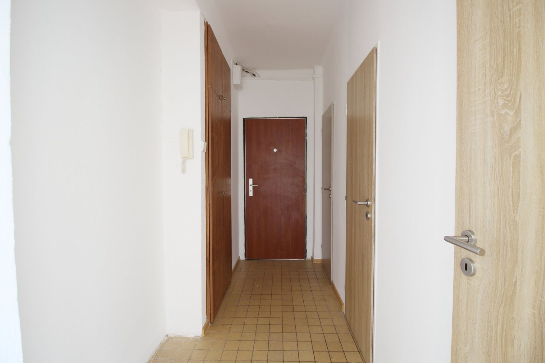 Dispozice zahrnuje kuchyni s bílou linkou a sporákem. Ostatní pokoje jsou nevybavené, připravené pro váš vlastní nábytek. V koupelně je vana, toaleta je oddělená. Praktickým prvkem je vnitřní komora s přípojkou na pračku a prostorná předsíň.