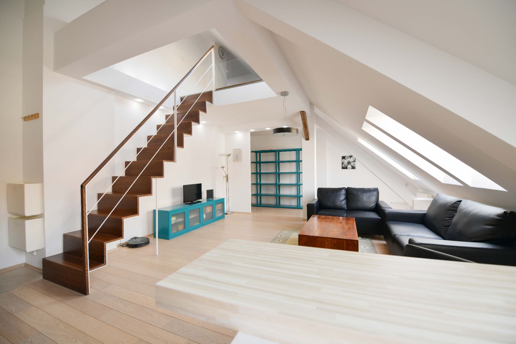 This is a first‑owner apartment, designed with an emphasis on detail, comfort, and timeless design. The highlights of the interior include an airy and open layout, wooden floors, a bespoke kitchen by the renowned company Tosca Interier with a pull‑out extractor hood, and a designer staircase leading to a built‑in gallery.