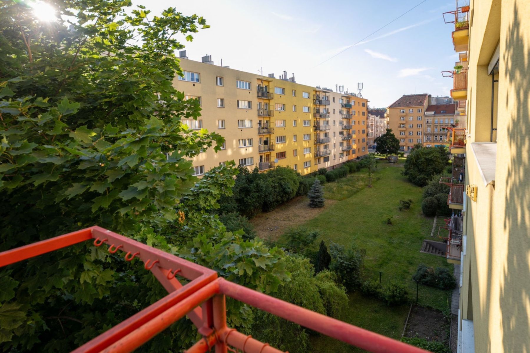 Byt je orientován na západ s výhledem do klidné společné zahrady, což zajišťuje dostatek odpoledního a večerního světla a příjemnou atmosféru během dne.