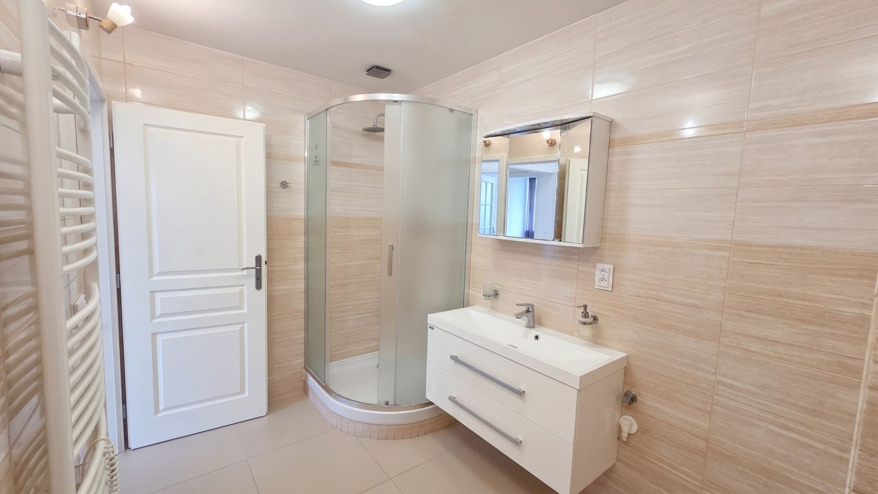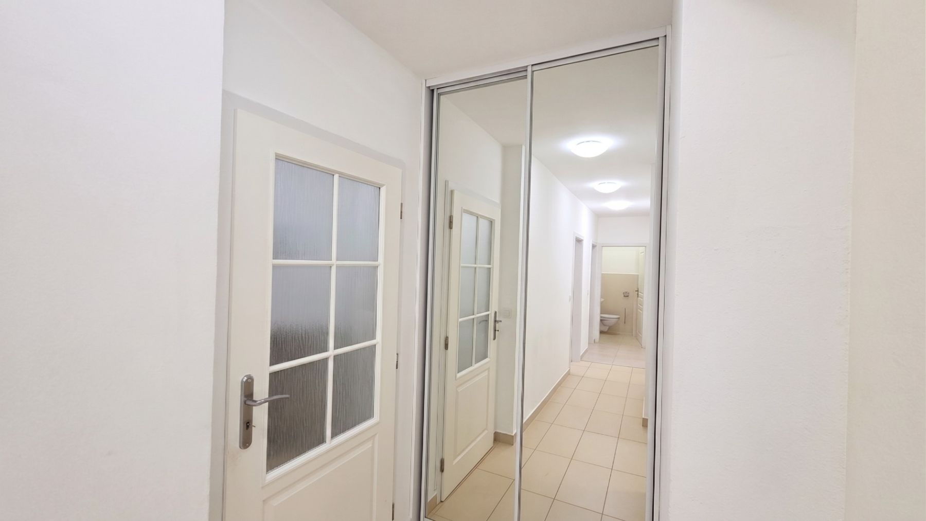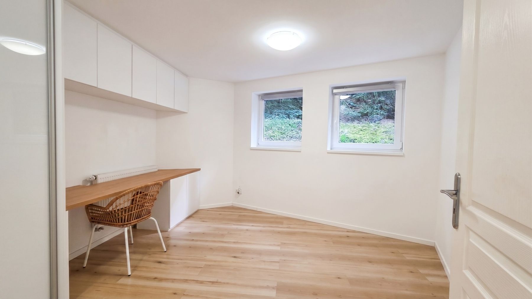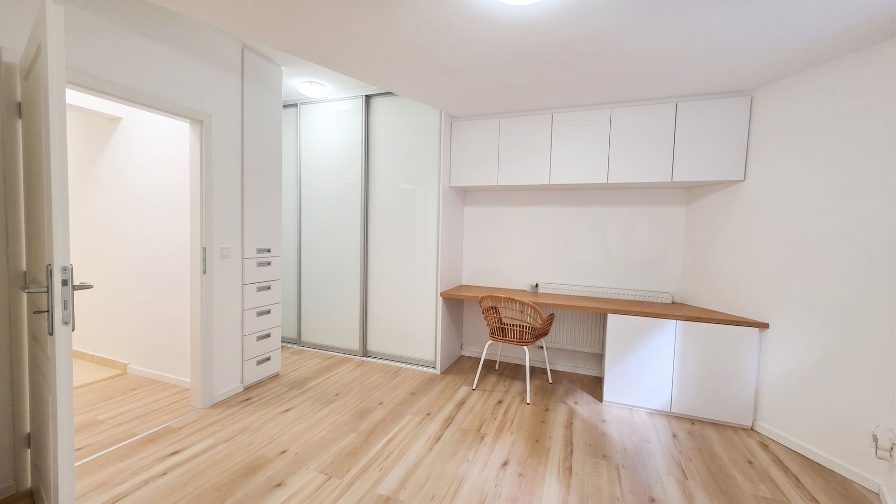 The apartment is arranged as two separate units: the left section has a 2+kk layout, while the right section is 3+kk, connected by a shared entrance hall. Each section has one bathroom, and there are three toilets in total. The standout feature of the apartment is a modern, luxurious kitchen equipped with top-of-the-line AEG appliances and two Samsung refrigerators. Custom-built wardrobes and storage spaces are installed in two bedrooms as well as in the hallways. The utility room is equipped with a sink, worktop, built-in furniture, a washing machine, and a dryer. The selling price also includes a parking space in the building on a lockable parking system.