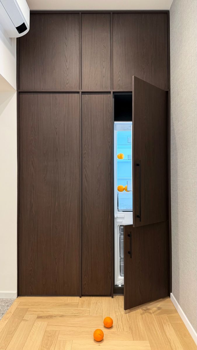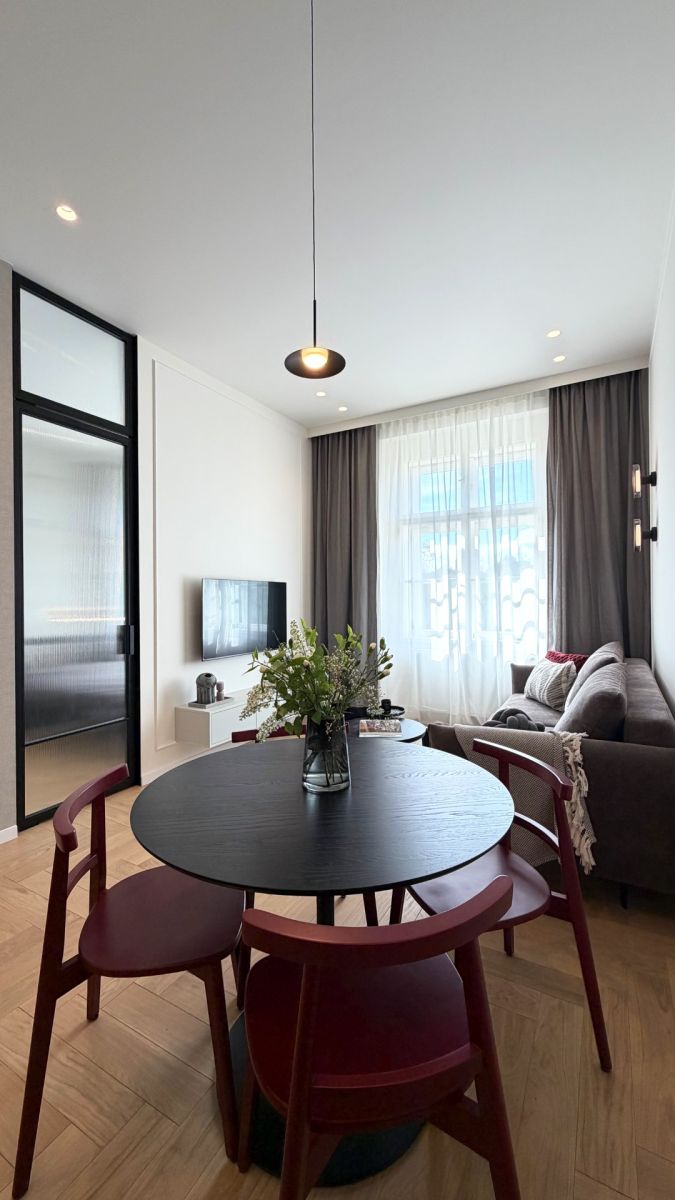 The 2-room layout is very efficiently planned – a spacious living room seamlessly flows into the kitchen with elegant, rounded lines. The kitchen is fully equipped with Siemens appliances (oven, full-size refrigerator, induction cooktop embedded in the countertop, dishwasher, and extractor hood).