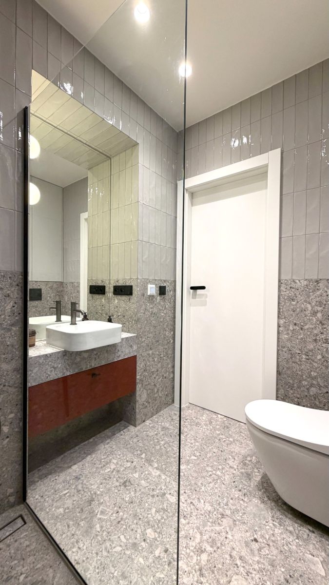 The interior is fully furnished with custom-made furniture complemented by designer elements. The apartment offers ample storage space and a comfortable setup for working from home. The whole space feels very clean, calm, and timeless – ideal as a comfortable home in the city center. Included in the amenities are also a washing machine and a Smart TV in the living area.