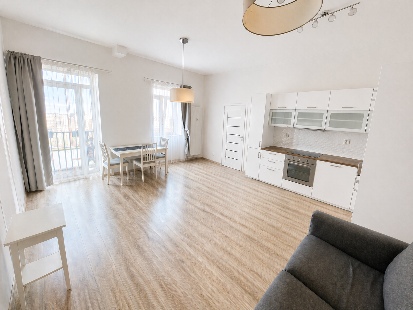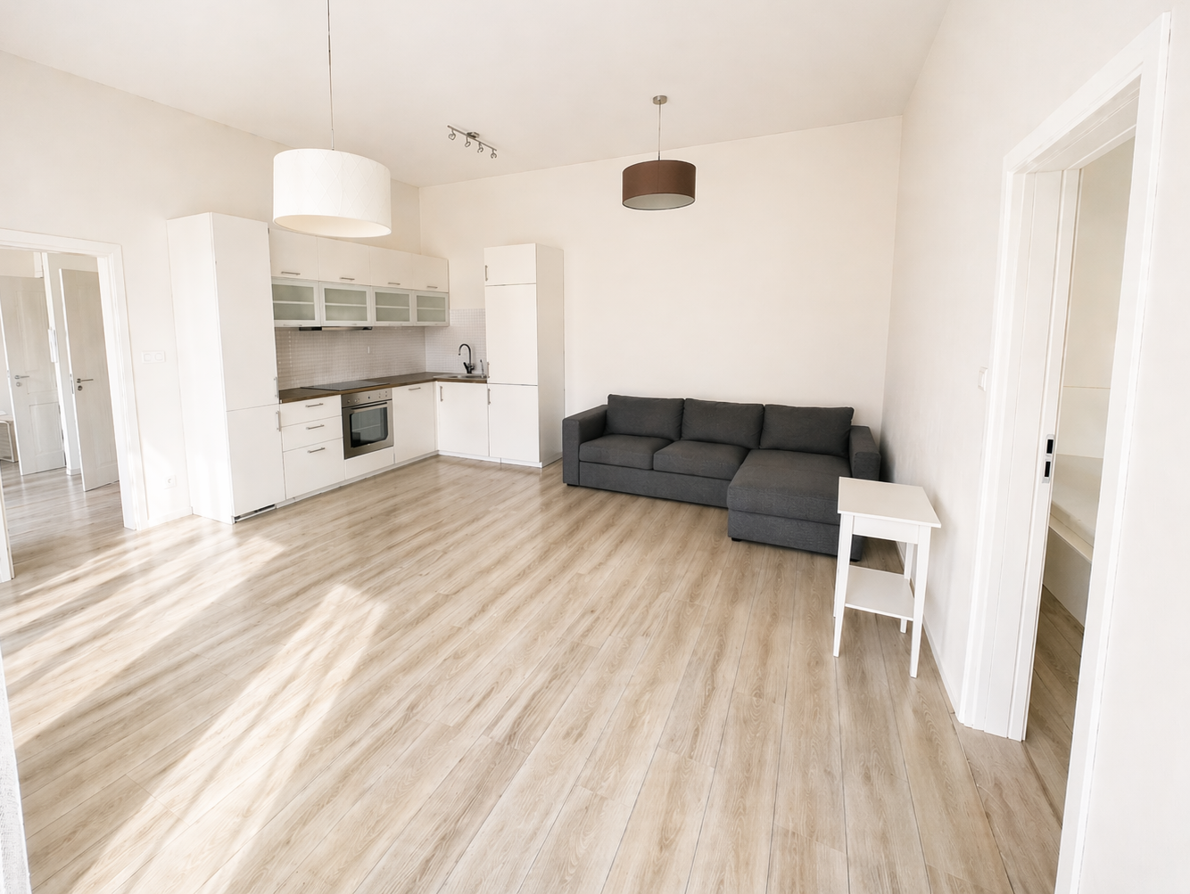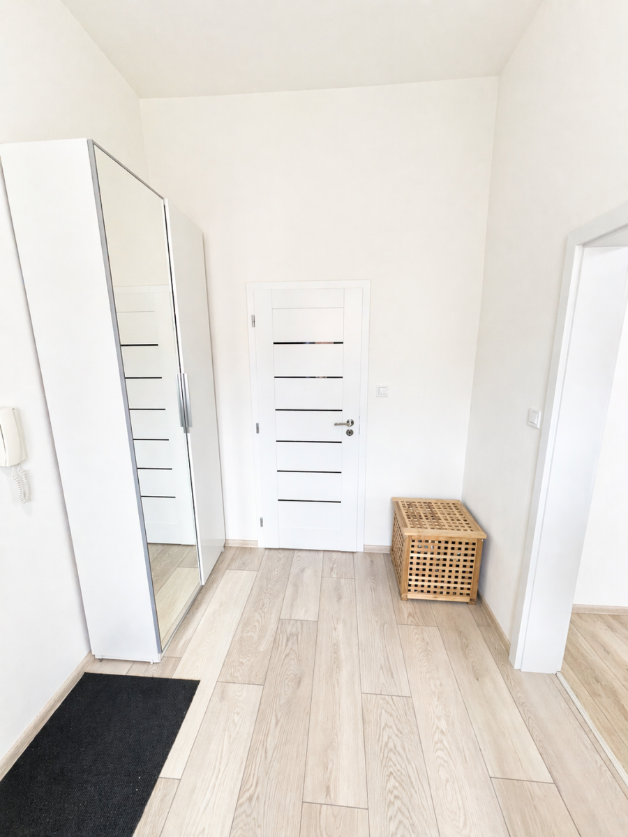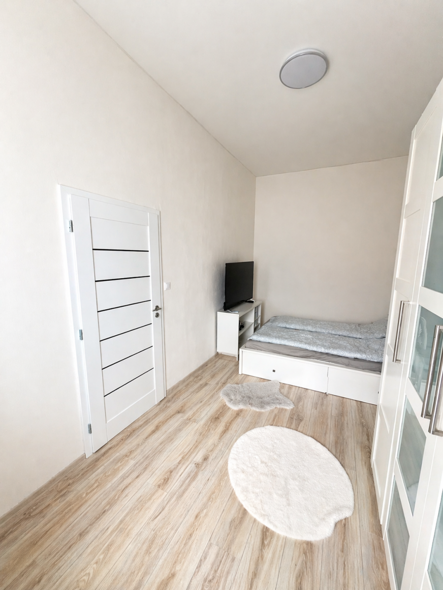 Dispozici tvoří prostorný obývací pokoj s kuchyňským koutem a vstupem na balkon. Díky 4 oknům směřujícím do vnitrobloku je byt je velmi světlý. V domě jsou pouze 2 byty na patře a stěnami nesousedí s žádným dalším bytem, což přispívá k většímu soukromí. Celý bytový dům je zabezpečen kamerovým systémem.