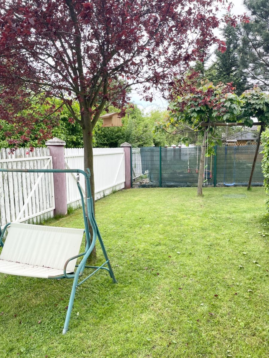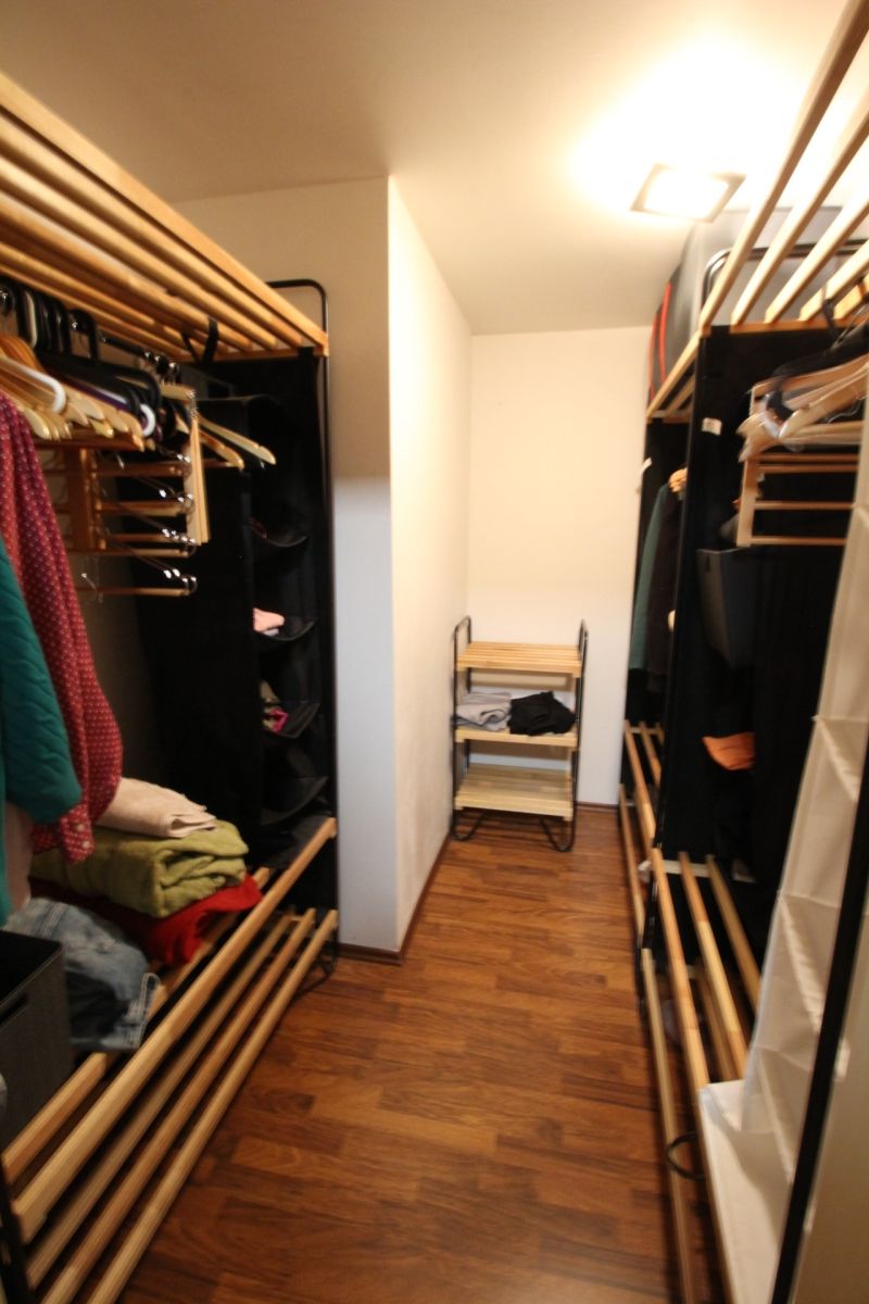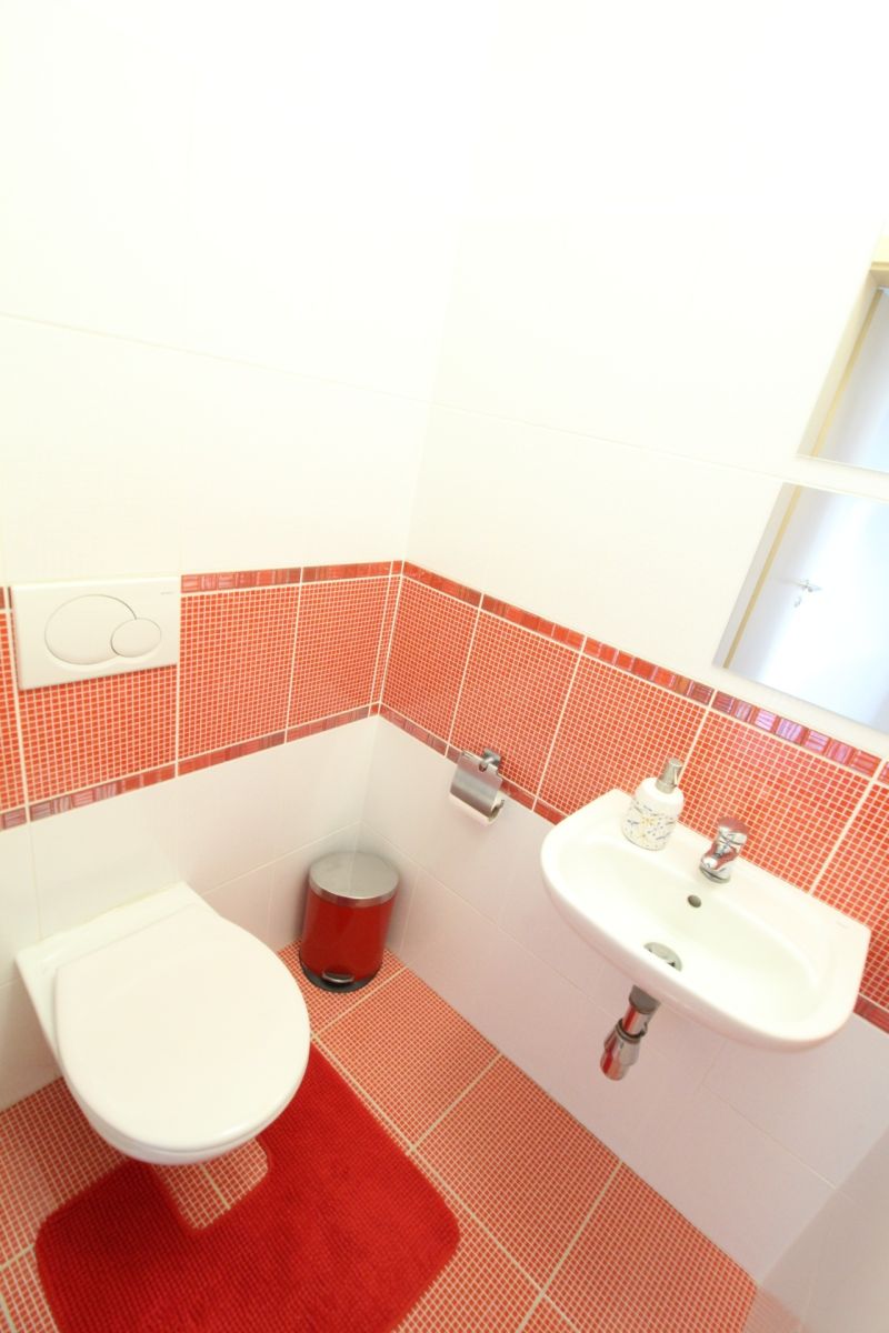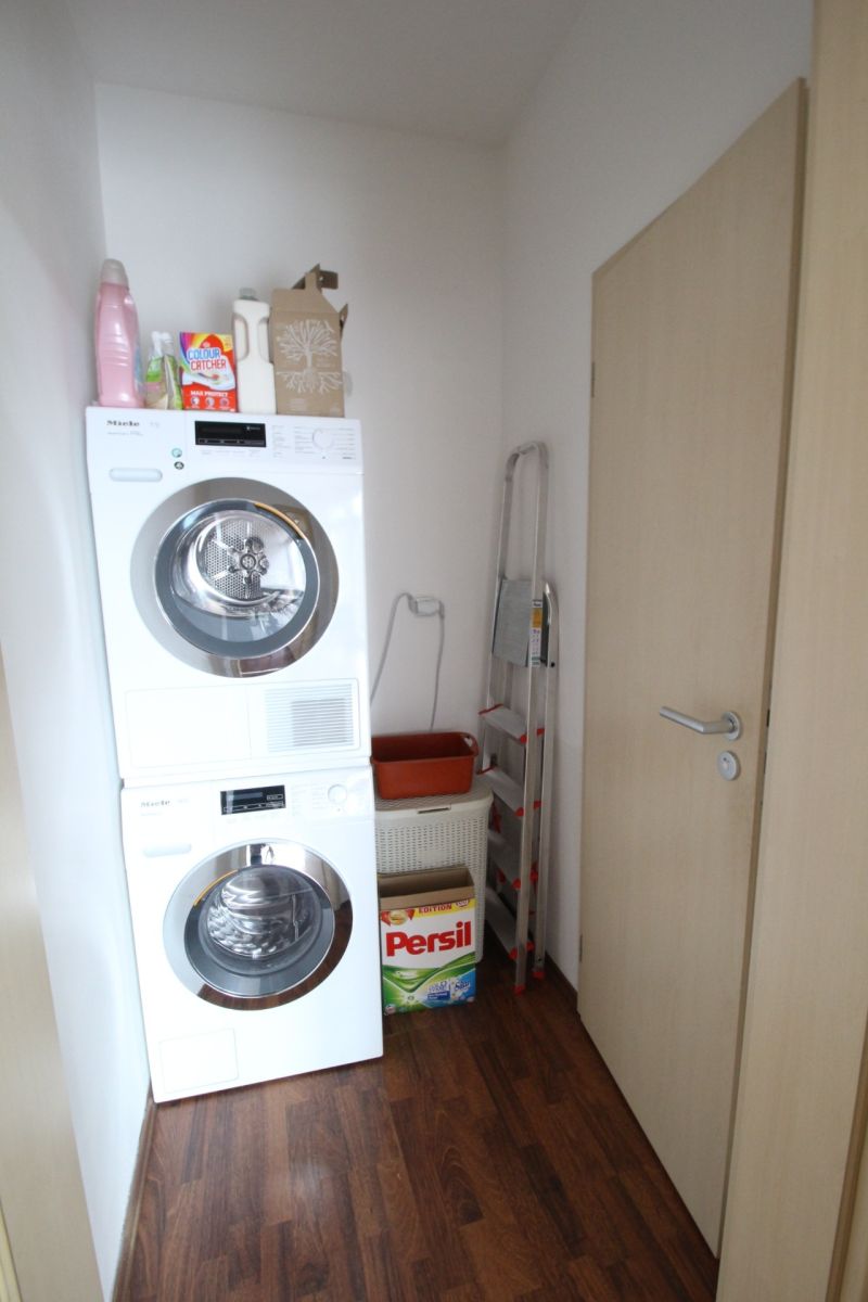 Tento byt se pronajímá kompletně zařízený a každá obytná místnost má klimatizaci. Kuchyň s obývacím pokojem se nachází v patře a disponuje kuchyňskou linkou s elektrickou varnou deskou, digestoří, vestavěnou elektrickou troubou a mikrovlnnou troubou, myčkou, lednicí s mrazákem a rychlovarnou konvicí. Obývací pokoj je plně připraven k užívání. Naleznete zde sedací soupravu, komodu s TV, lampu, jídelní stůl se židlemi, úložné prostory a jiné. Z obývací části se dostanete na prostornou terasu, na které se nachází posezení s výhledem do zeleně. Z obýváku se také dostanete do první ložnice, ze které je přístup do koupelny se sprchovým koutem a toaletou. Tato ložnice disponuje jednolůžkovou postelí s psacím stolem a úložnými prostory. Dále je z obýváku vstup do technické místnosti, kde je pračka se sušičkou a další toaleta. Hlavní ložnice se nachází v přízemí a disponuje dvoulůžkovou postelí, nočními stolky a úložnými prostory. Z hlavní ložnice je také přístup do samostatné koupelny, která disponuje vanou a toaletou. Ve vstupní chodbě se nachází prostorné vestavěné skříně a je zde vstup do oddělené šatny. Dále je zde vytvořen úložný prostor, který je z chodby oddělen závěsem. K bytu náleží menší sklep a možnost využití společné zahrady. Vybavení bytu zobrazené na fotografiích nemusí odpovídat skutečnému vybavení bytu.