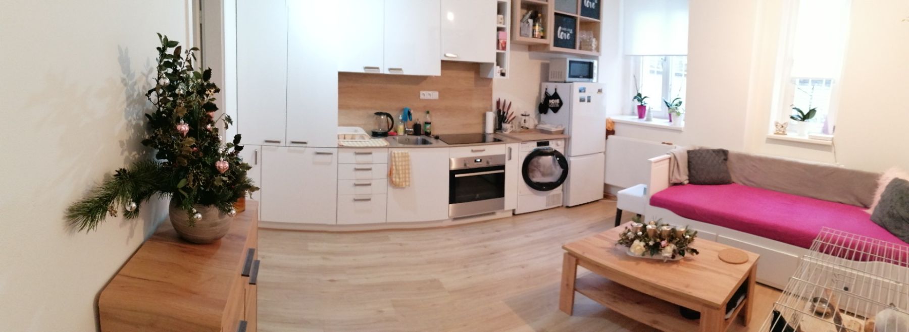 Na podlahách jsou vinylové parkety. Součástí vybavení ateliéru je nová kuchyňská linka v moderním stylu doplněná o nové spotřebiče - varná deska, trouba, digestoř a lednice s mrazákem.