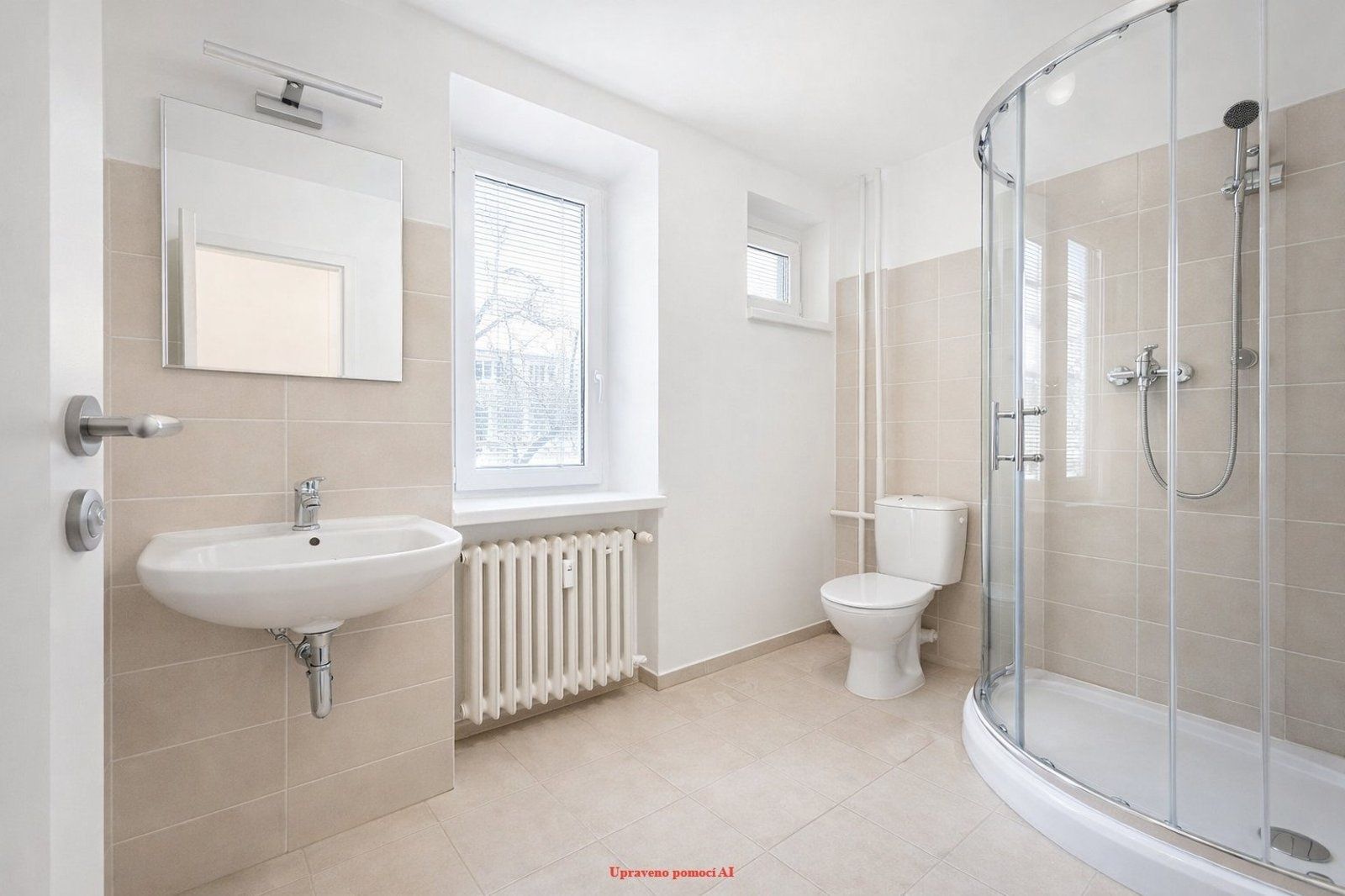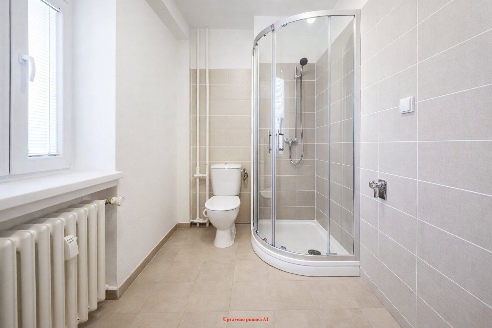 Koupelna společná s toaletou je laděná do moderního stylu a poskytuje sprchový kout i dostatek prostoru pro pračku a sušičku, takže splňuje všechny nároky na komfortní bydlení.