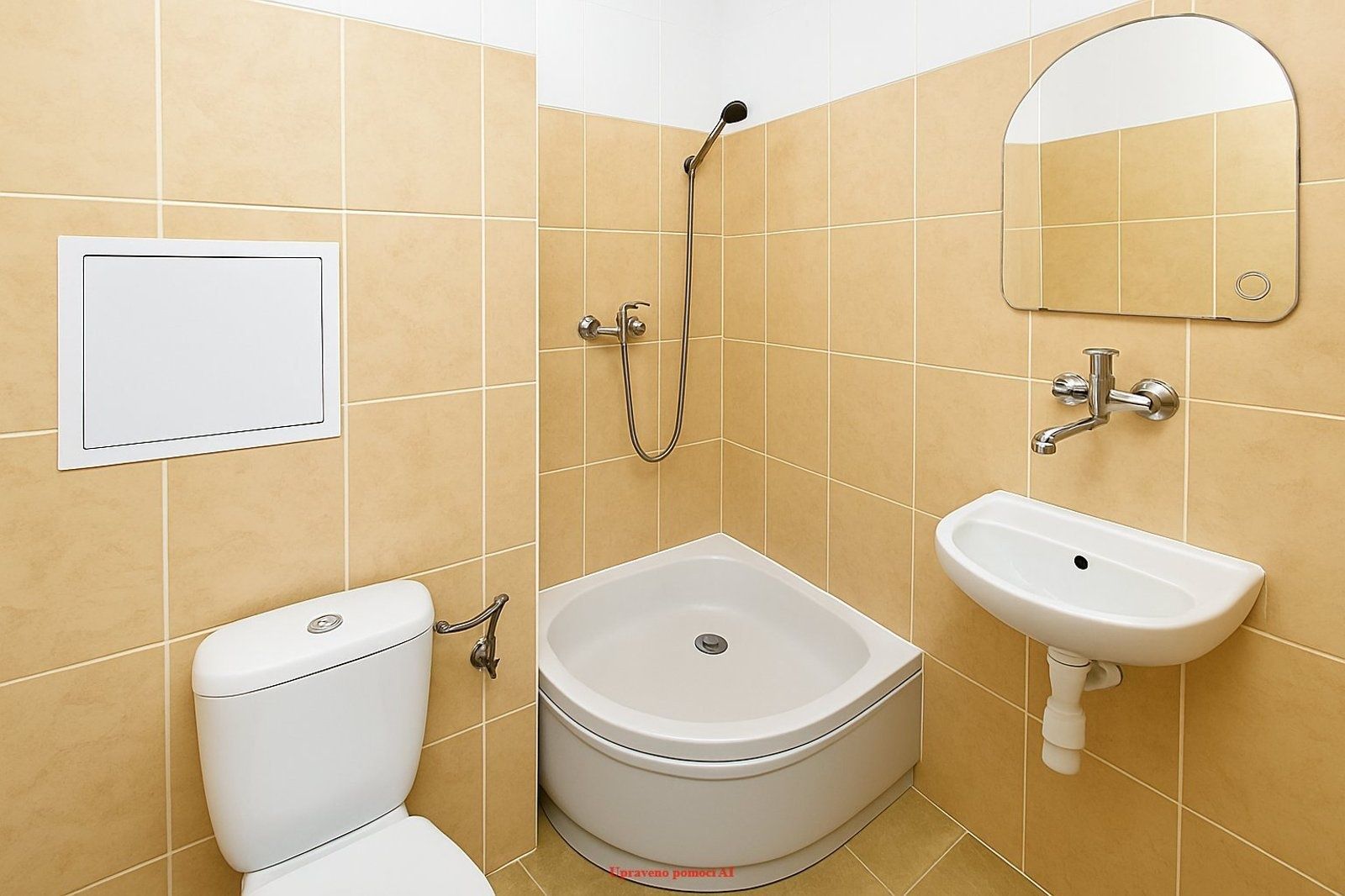 Vstup do koupelny se nachází v hale, kde najdeme také pěknou dlažbu a nové vstupní dveře. Koupelna je vybavena sprchovým koutem a toaletou. Obklady a dlažba jsou laděny do příjemného meruňkového odstínu, který působí svěže a harmonicky.