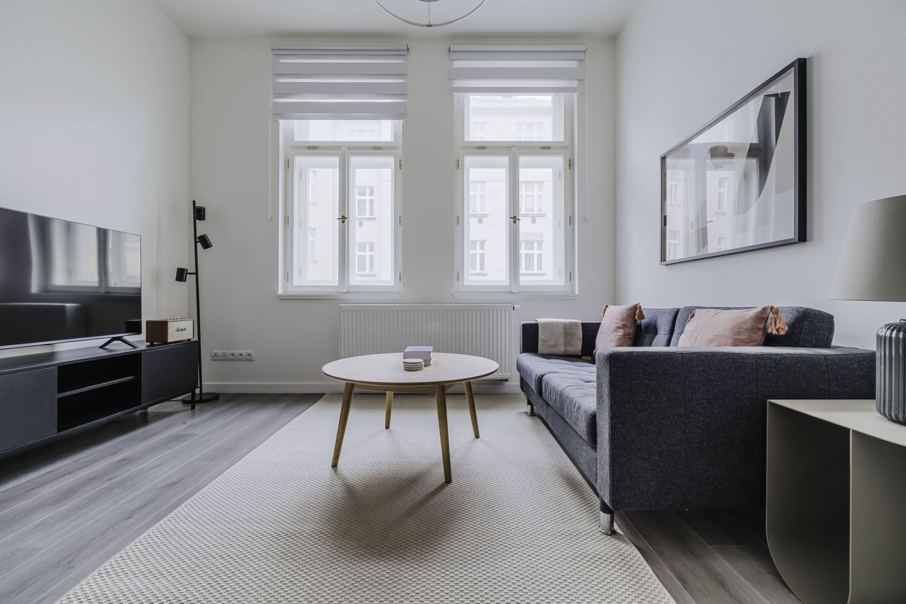 The apartment is furnished with a fully equipped kitchen, smart TV, Marshall speaker, and modern appliances like a dishwasher, washing machine, and microwave. It’s a perfect mix of historical character and contemporary comfort, making it feel like home from day one.