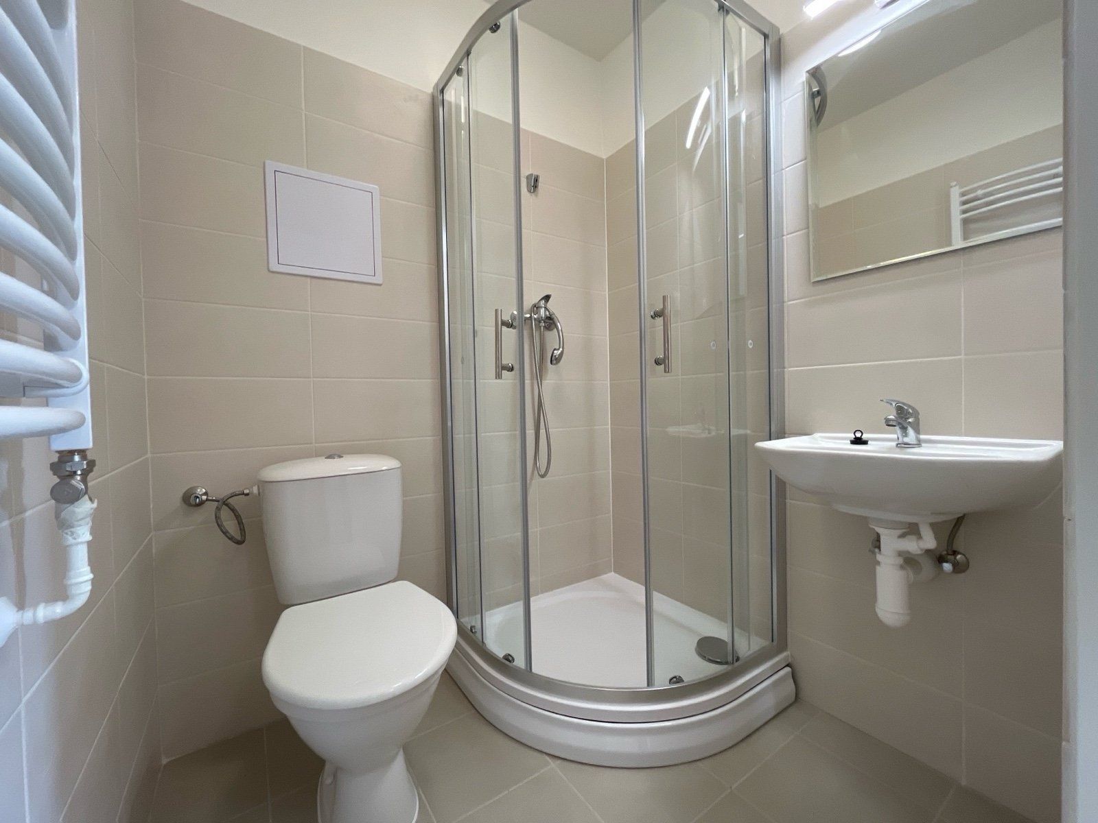 Perlou bytu je nádherná nově zrekonstruovaná koupelna se sprchovým koutem, která je prakticky spojena s toaletou a nabízí svěží, elegantní design.