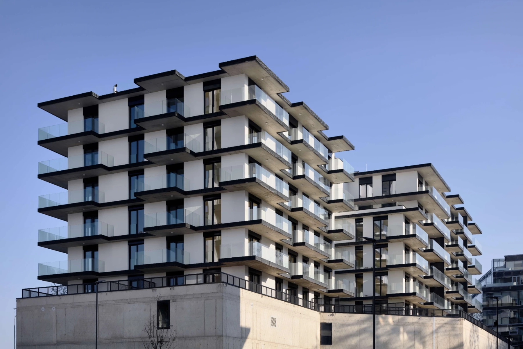 Do benefitů projektu patří posuvná velkoformátová okna, podlahové vytápění, rekuperace, chlazení, alternativní zdroje energie pro snížení nákladů (tepelná čerpadla a fotovoltaika). Projekt má také střešní terasu přístupnou všem obyvatelům.