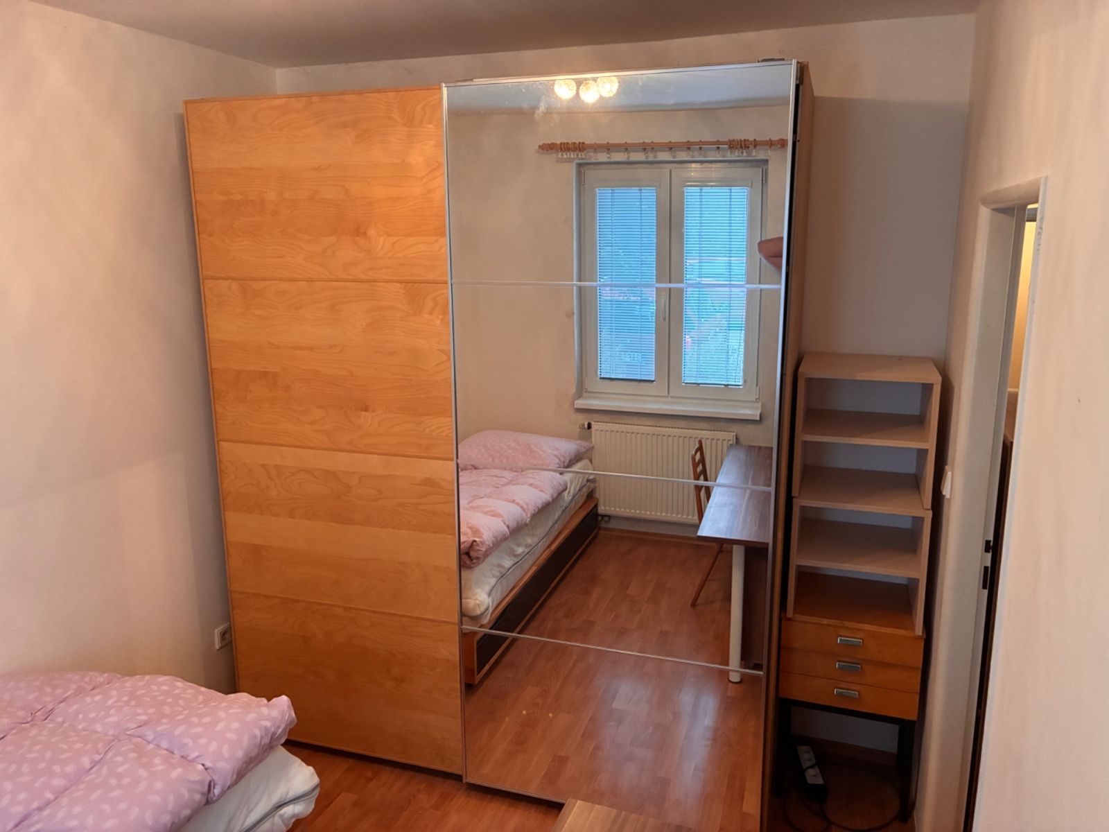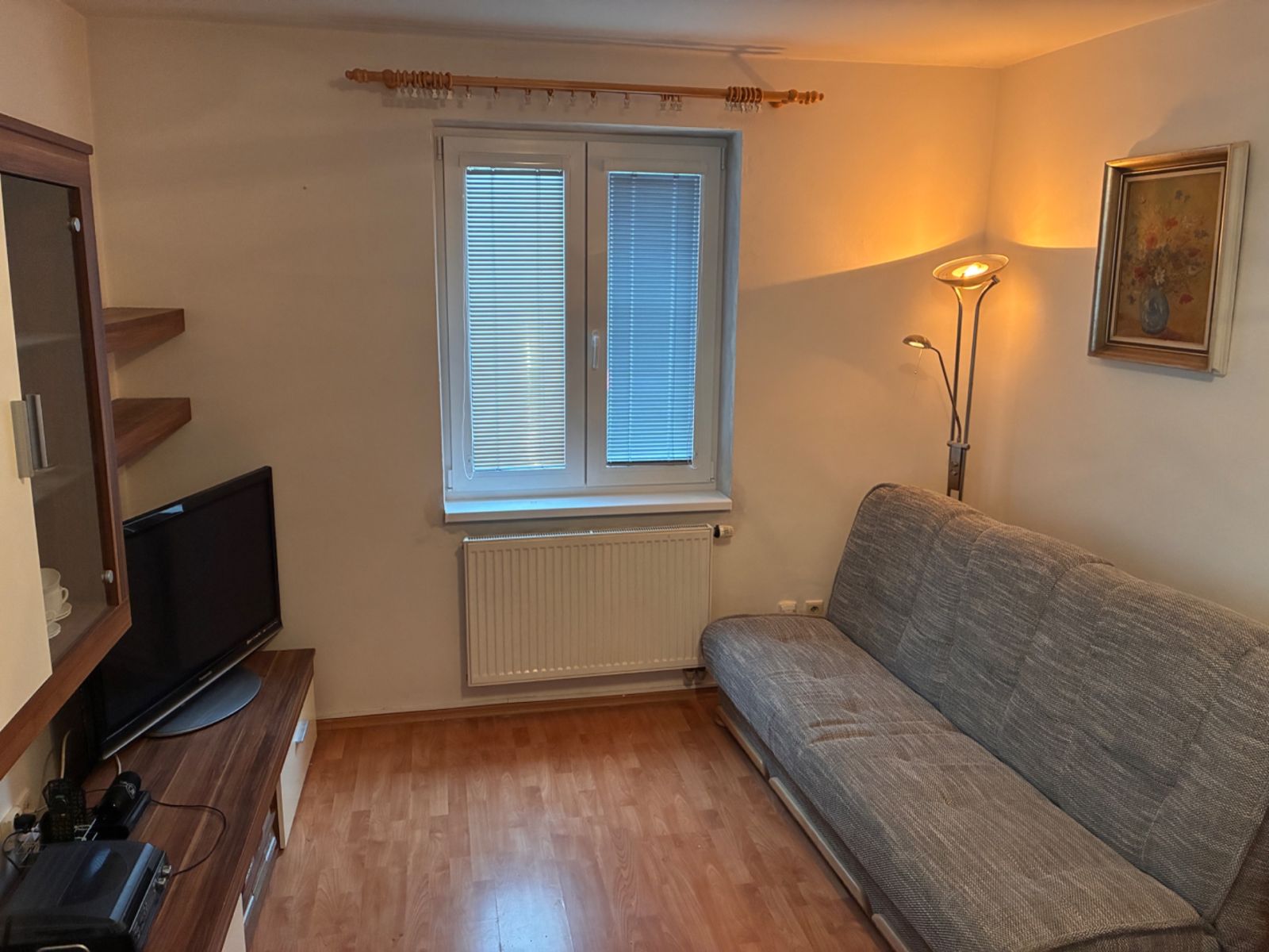 Dispozice a vybavení: předsíň, komora, dvě samostatné obytné místnosti (jedna s kuchyňskou linkou včetně sklokeramického sporáku, elektrické trouby a lednice s mrazákem), dále koupelna s vanou a samostatné WC. V bytě jsou plovoucí podlahy a dlažba v předsíni, koupelně a na WC.